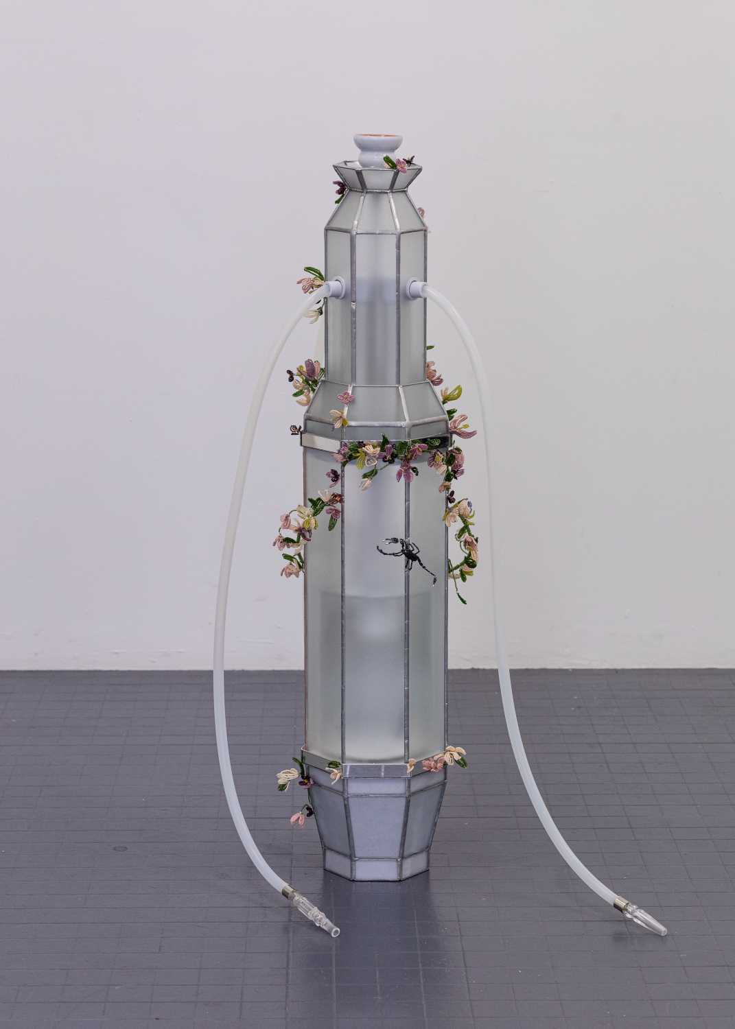 La trentaine d’œuvres présentées s’appuie sur la rencontre entre gestes hérités et technologies de précision. La technique du vitrail, notamment celle du Tiffany, permet des compositions fines et détaillées aux lignes organiques, tandis que le recours aux machines‑outils à commande numérique assure une grande exactitude dans la mise en forme et l’assemblage. Cette continuité entre savoir‑faire manuels, outils industriels et protocoles contemporains prend toute son ampleur grâce à un partenariat avec la Tôlerie Forézienne, initié par la Cité du design dans le cadre du cycle Présent><Futur. Véritable espace de dialogue, cette collaboration inédite favorise une croisée des savoirs et des univers, où le dessin sensible de la designeuse se confronte aux contraintes et aux potentialités de la production industrielle, donnant naissance à des formes hybrides, à la fois rigoureuses et poétiques.