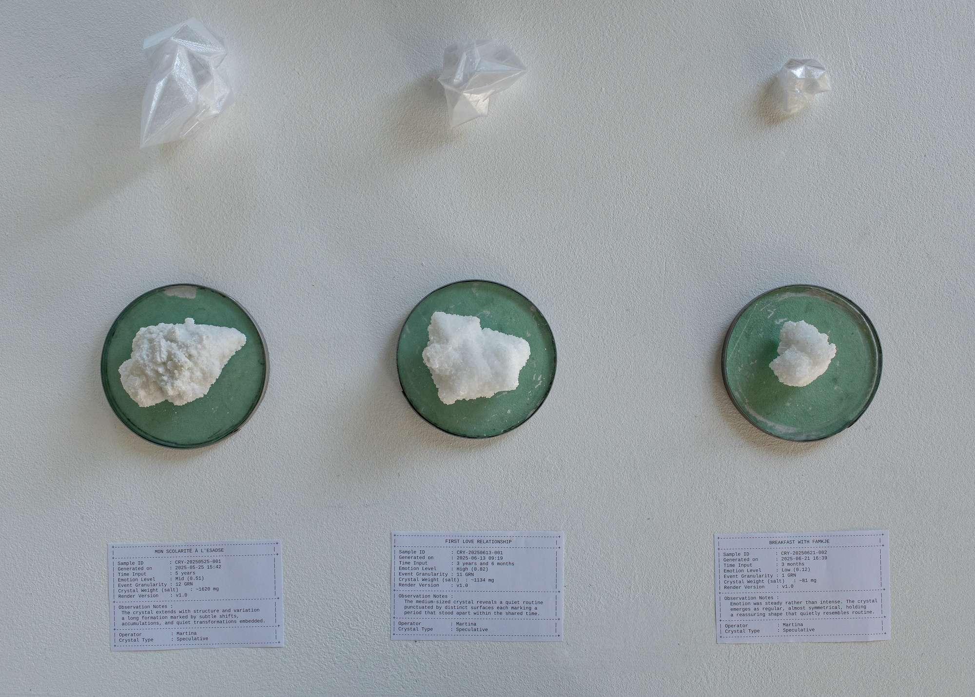 Des entités hybrides, tantôt techniques, tantôt affectives, ont pris forme comme des présences énigmatiques. certaines guidant, d’autres condensant le temps ou révélant des formes fossiles de mémoire. Un système distribué d’objets dialoguant a été mis en scène, laissant émerger l’hypothèse d’un langage non humain. Des récits latents ont été convoqués à travers des comportements, des cristallisations, des silences. L’ensemble a fonctionné comme un réseau de perception artificielle. Le projet a invité à écouter autrement les objets, non comme des outils, mais comme des témoins d’un autre ordre du sensible.
