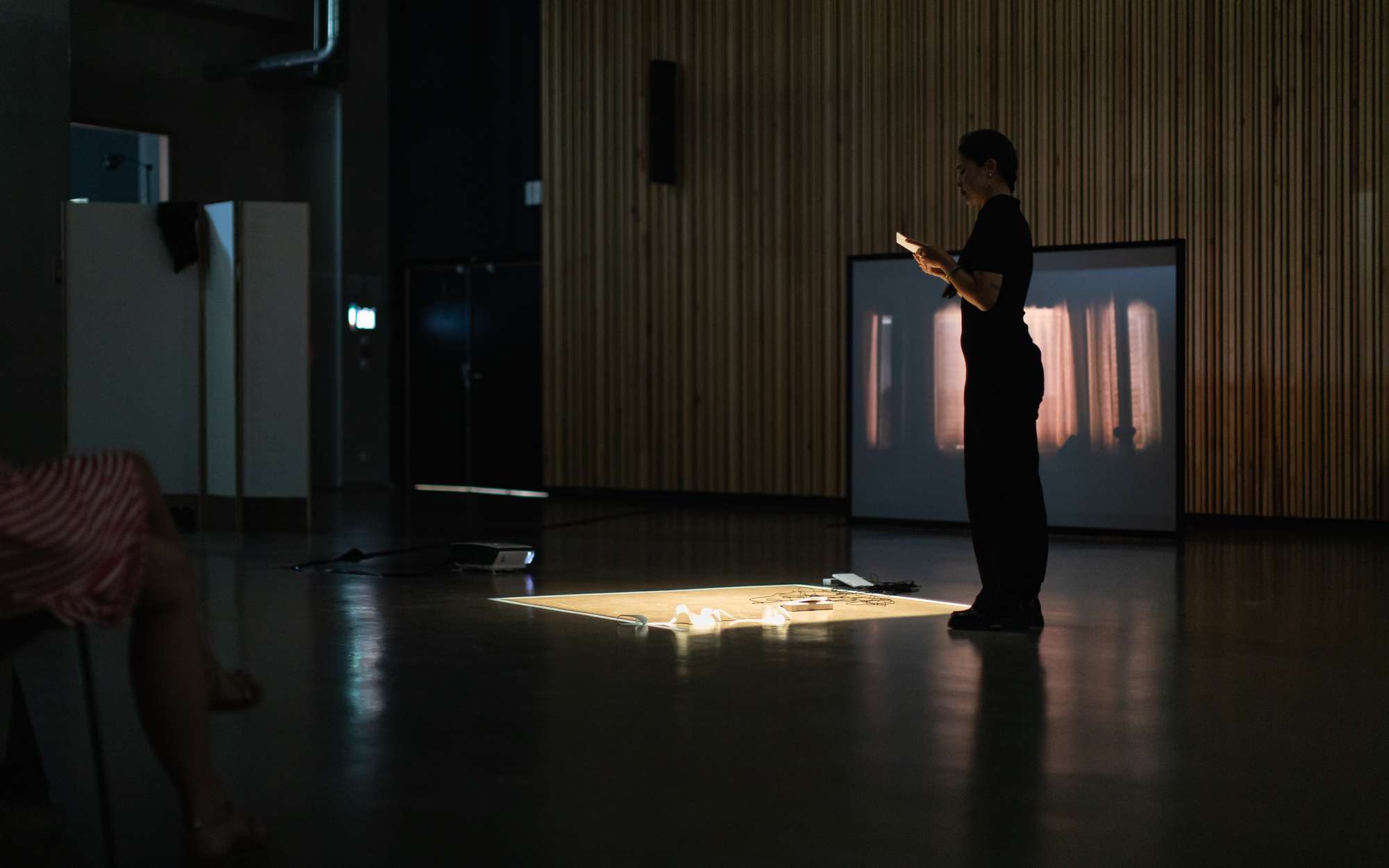 Cette performance réunit plusieurs formes d’expression, complémentaires et autonomes : projection, lecture, installation. L’oralité, envisagée au-delà de la parole énoncée, en constitue le cœur.