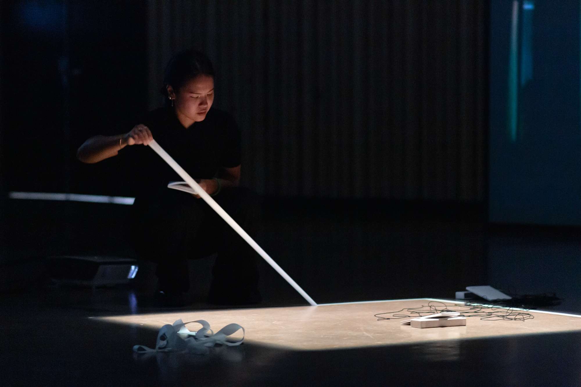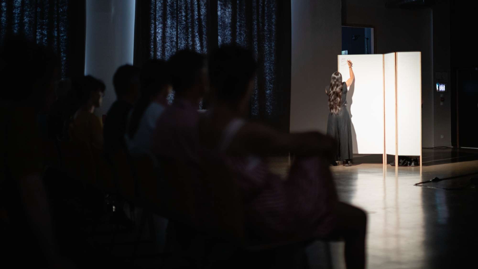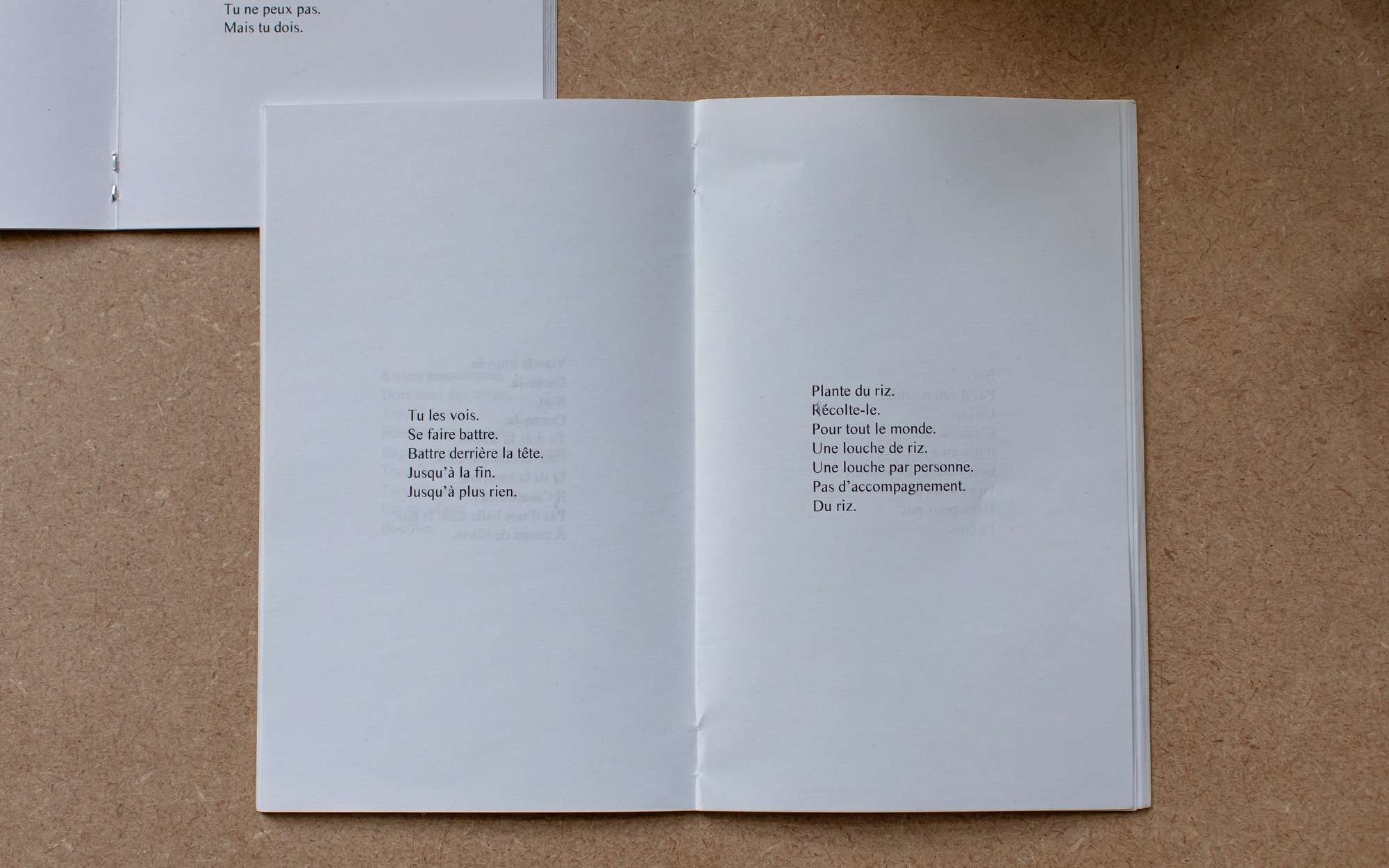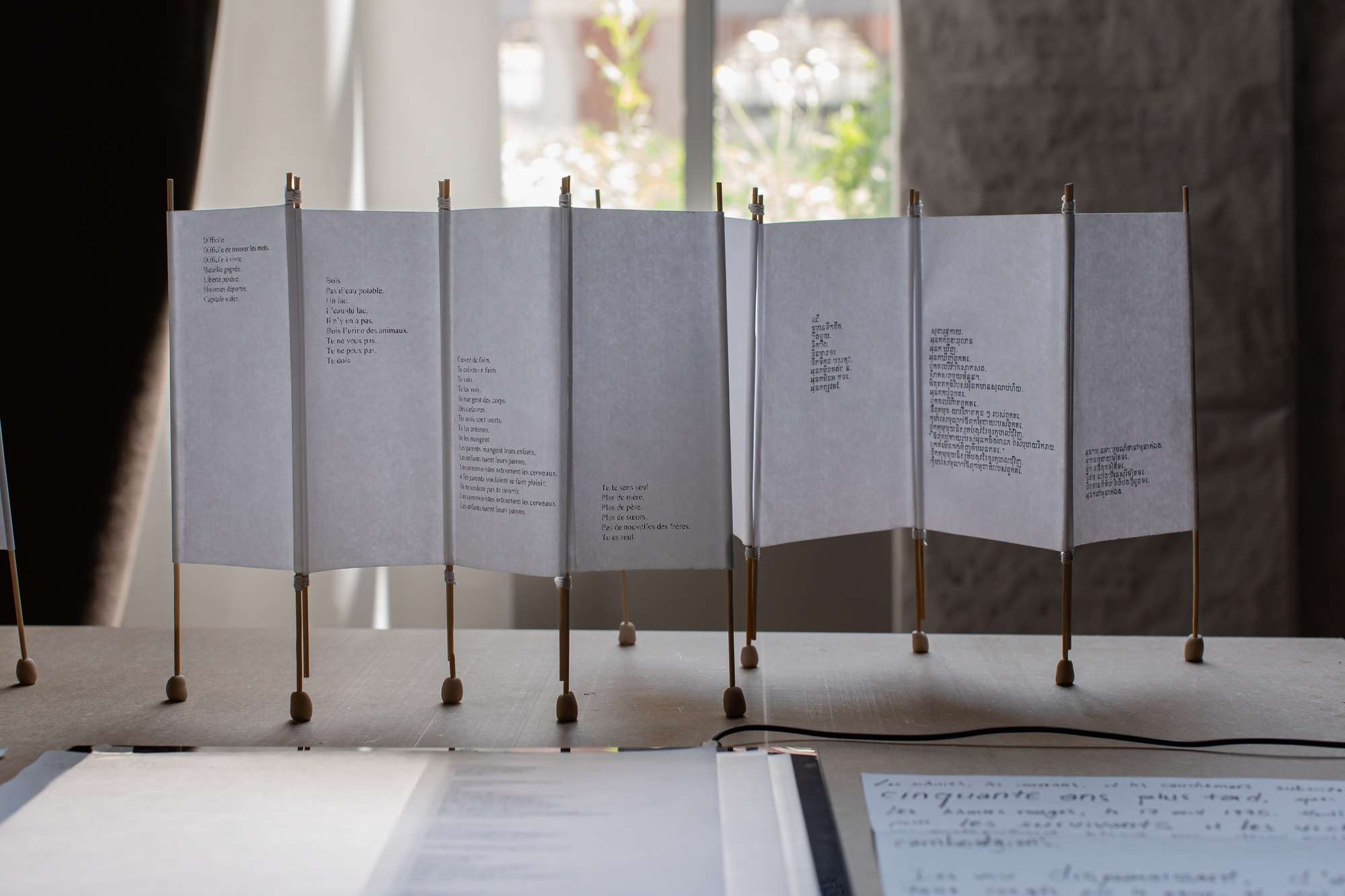 Dans le fragment de mon film "Sous l’Ombre de son Silence", elle s’exprime par les silences et le langage corporel. Dans la lecture de mon livre "Jamais prêt", elle se déploie à travers des phrases simples et impactantes. Sur le paravent, conçu comme une installation, elle se tisse dans la rencontre des mystères partagés entre mon père et moi, et dans la superposition des langues khmère et française.