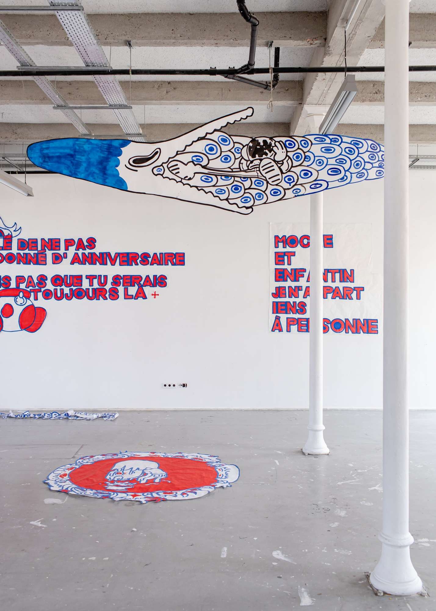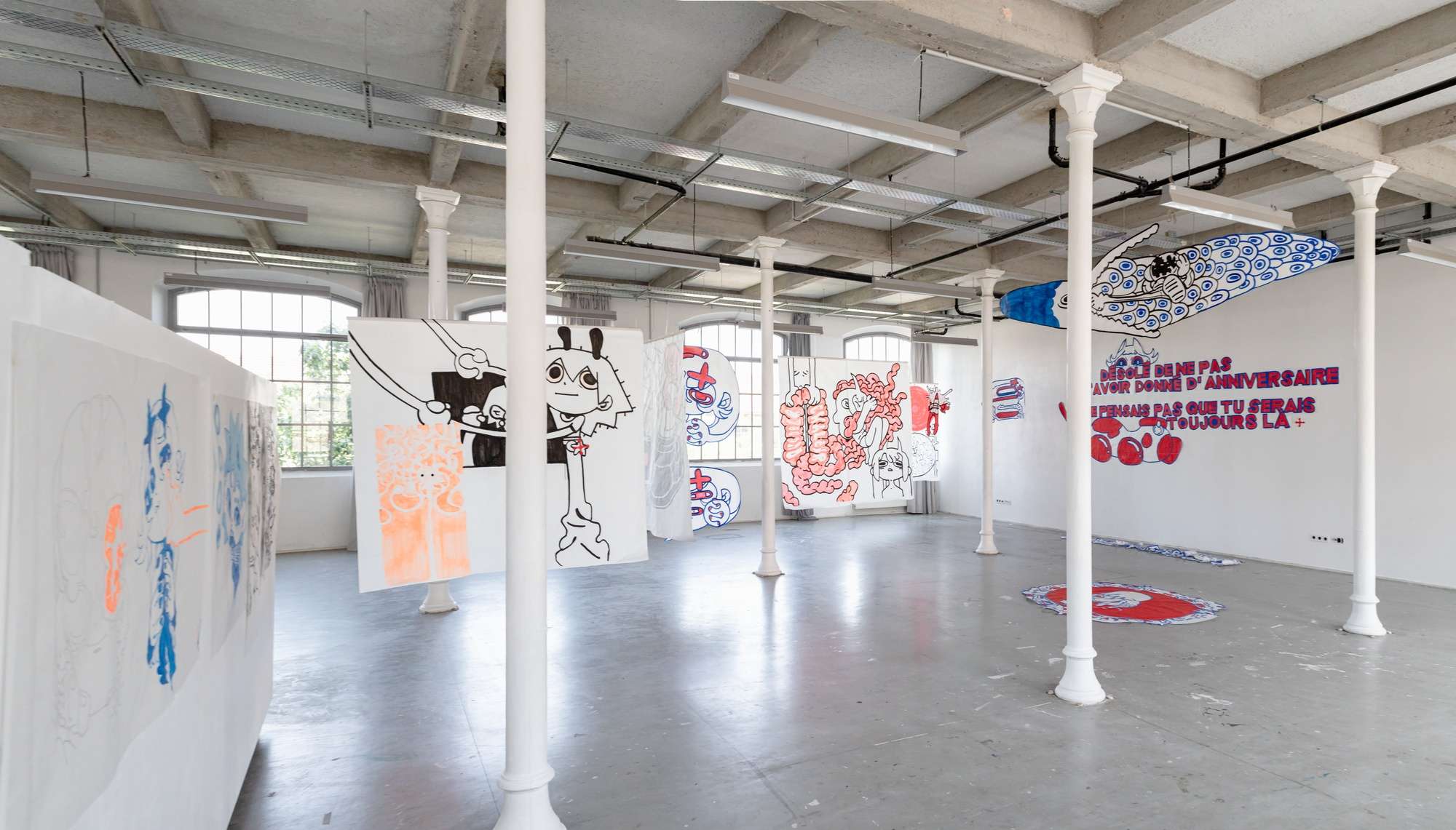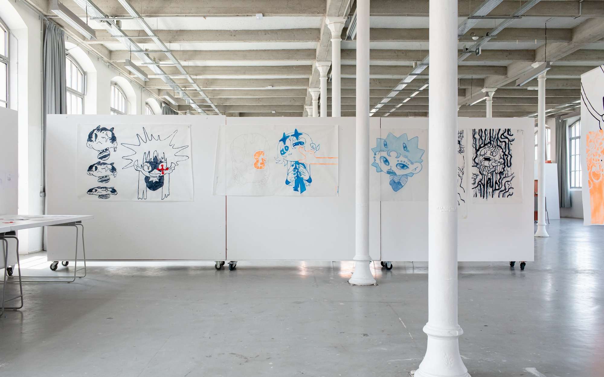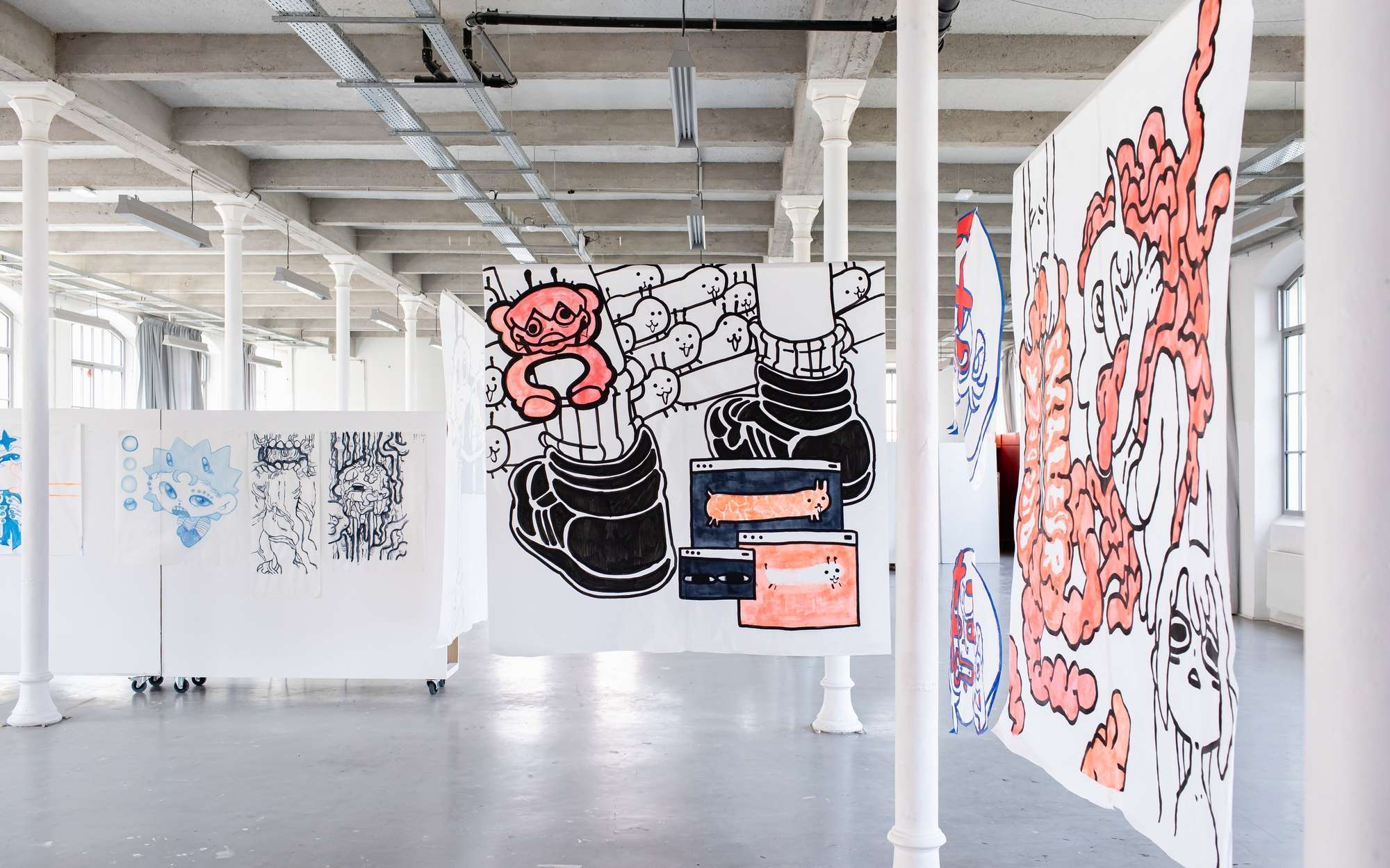 À partir de ma pratique du dessin et de ma culture de l'image, j'interroge le rapport entre le spectateur et le visuel. Ma réflexion passe par les formes, la composition et le format dans le dessin. Une myriade de personnages évoluent dans mon projet, occupant l'espace avec le public.