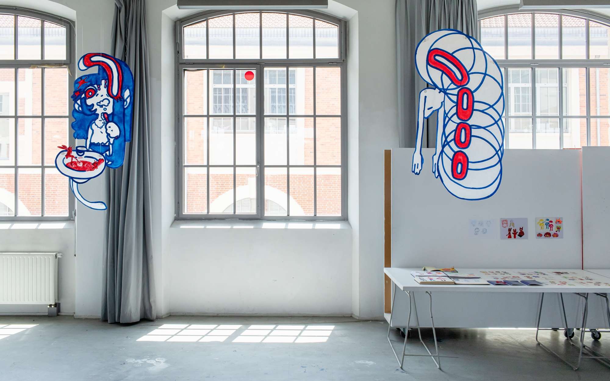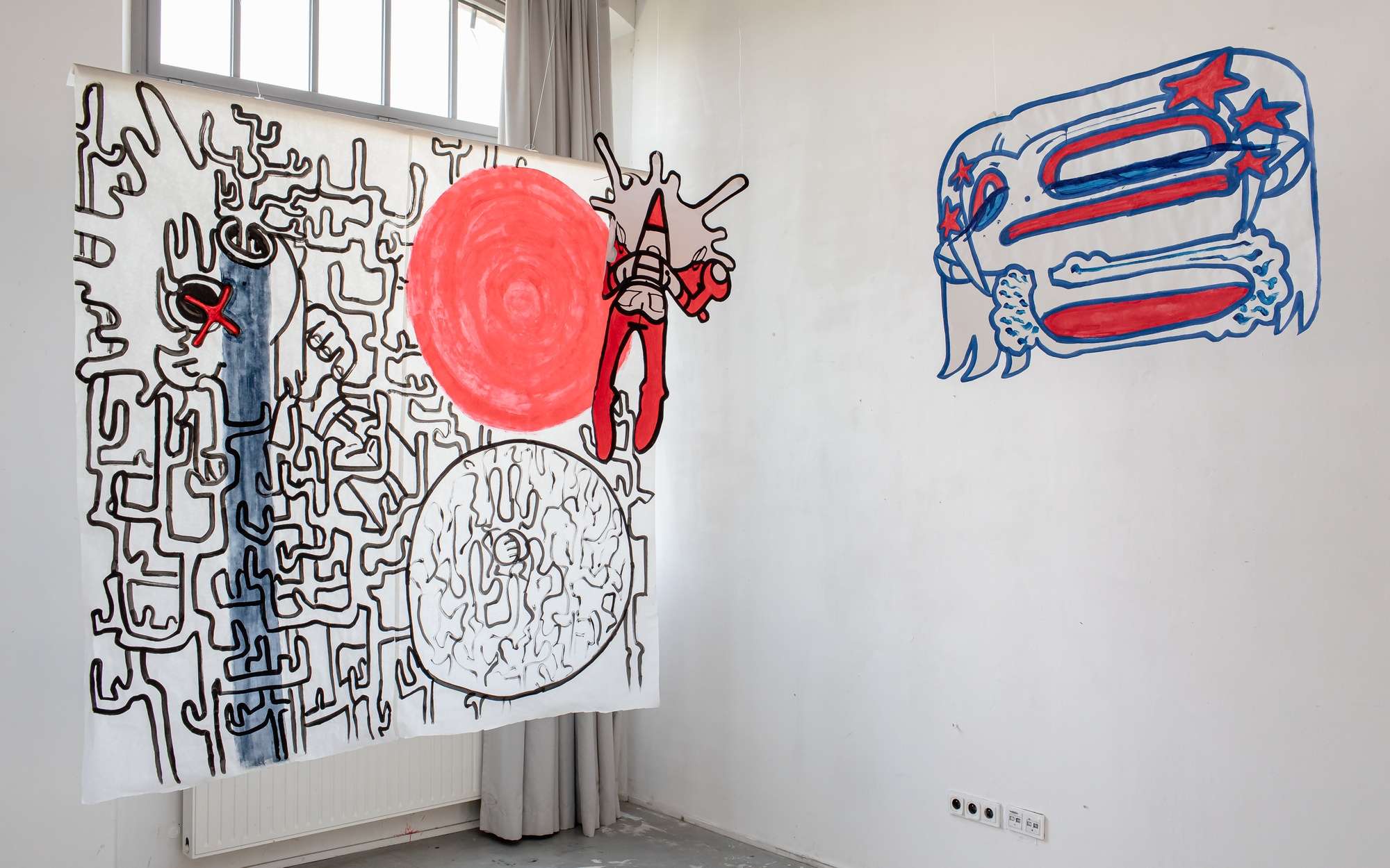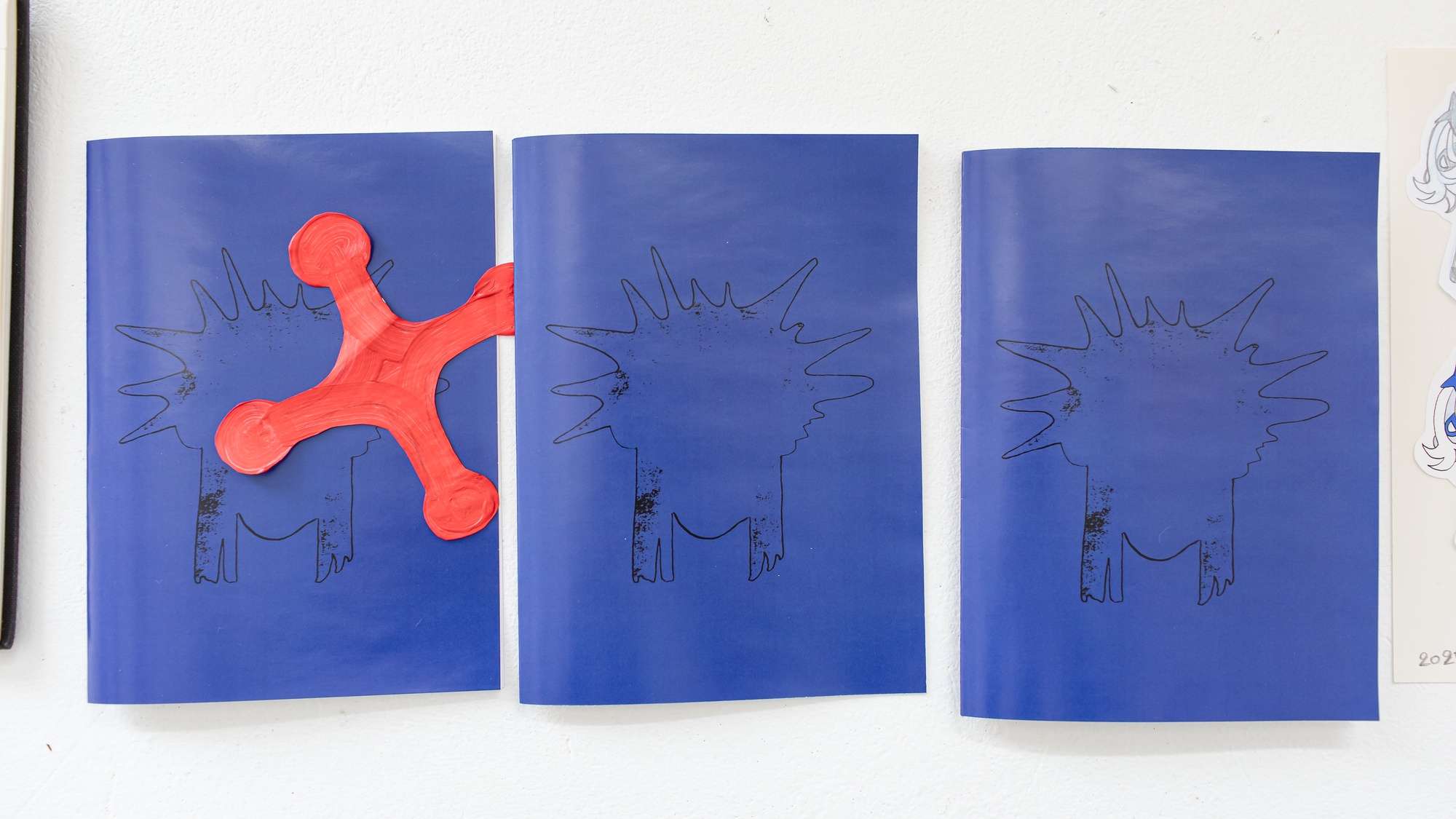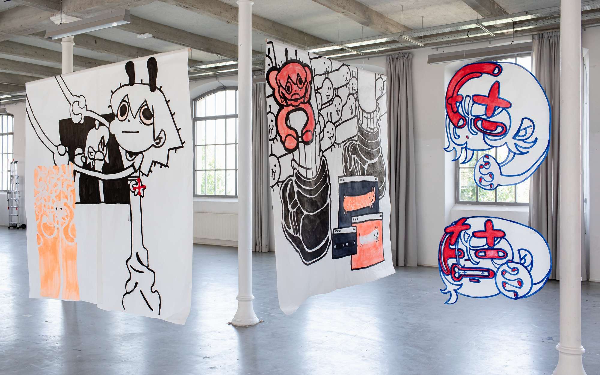 À partir de ma pratique du dessin et de ma culture de l'image, j'interroge le rapport entre le spectateur et le visuel. Ma réflexion passe par les formes, la composition et le format dans le dessin. Une myriade de personnages évoluent dans mon projet, occupant l'espace avec le public.
