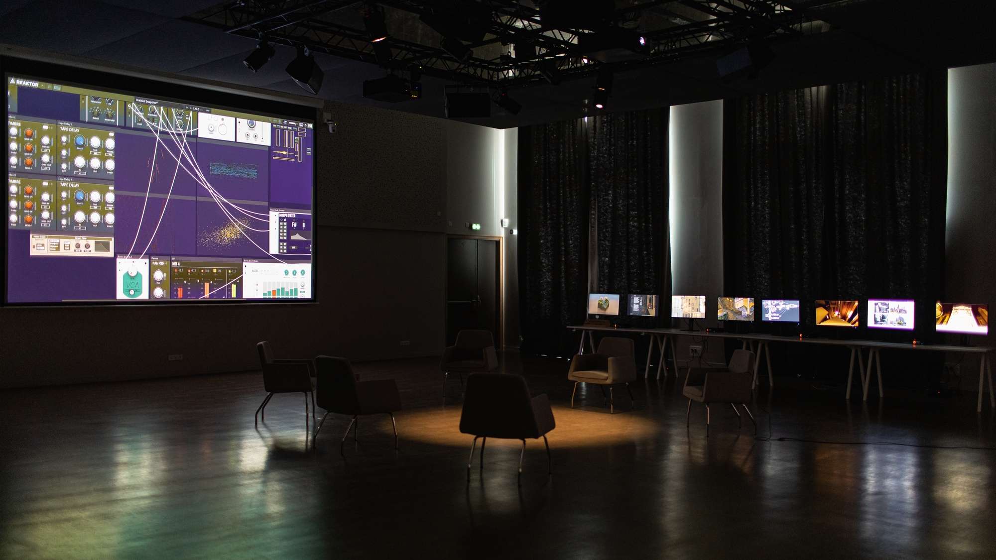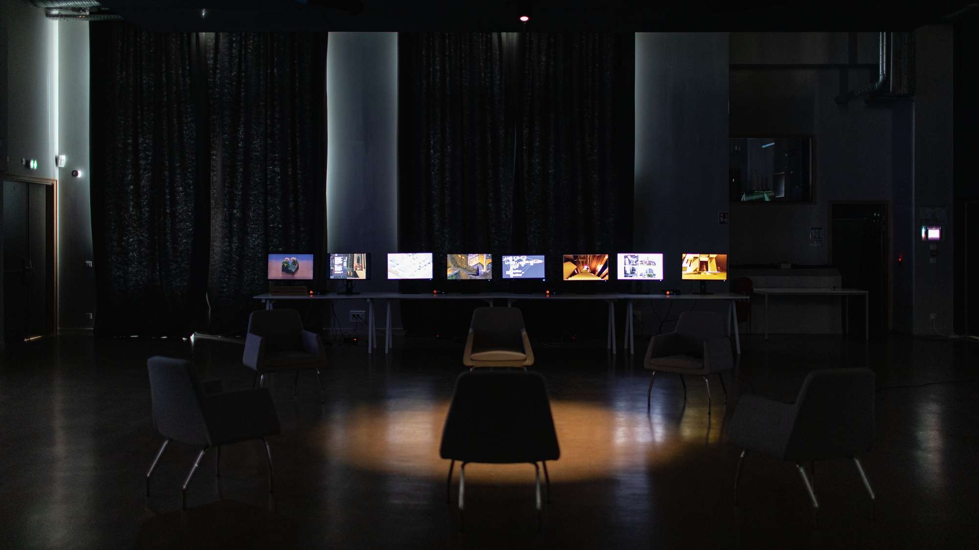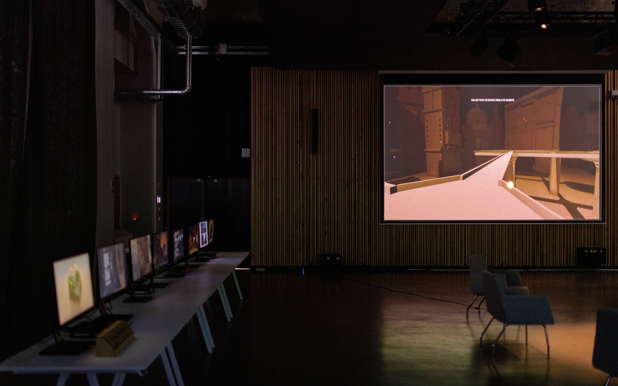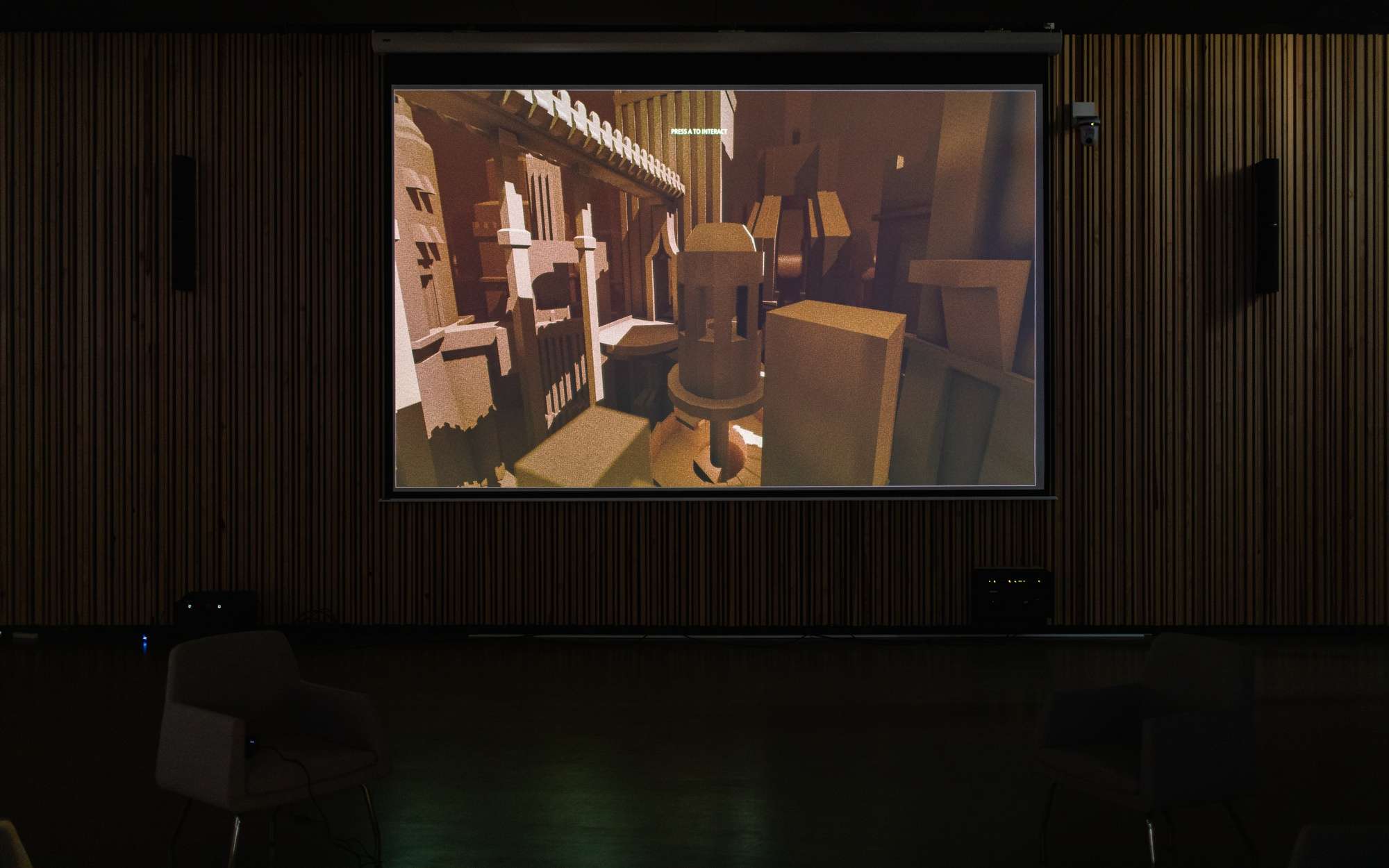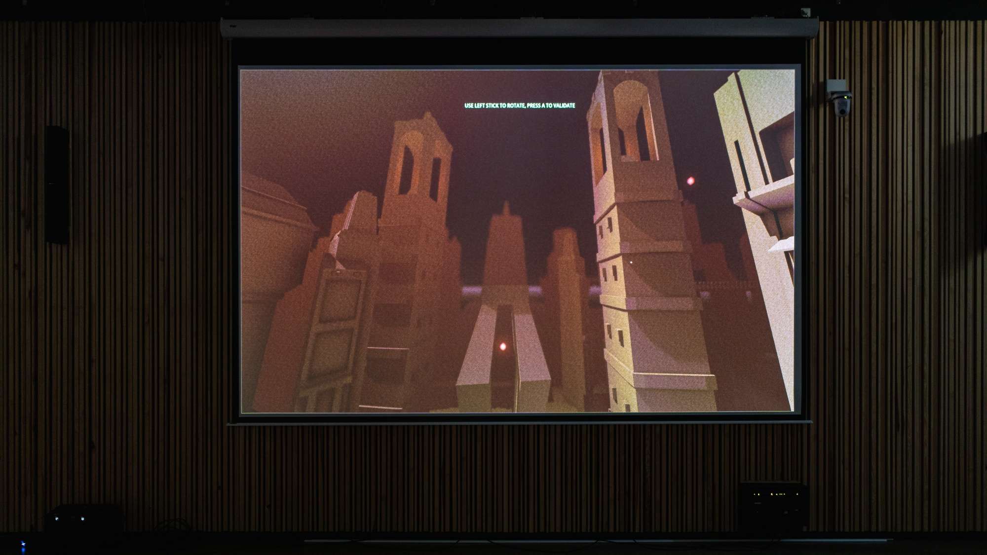 Comment façonner un espace de création venant faire interagir des éléments sans lien direct ? On est ici plongé d'en un environnement architectural que l'on découvre et explore. Il y est possible d'y modifier l'architecture. L'environnement sonore change en fonction de choix architecturaux. Cette double interaction entre création musicale et architecturale est la racine même de ce projet. Mes choix sonores influencent mon architecture et vice-versa. Ce projet est à la frontière de l'instrument, du jeu vidéo et de l'outil de création visuel. Son flou de statut permet un changement dans la manière de moduler des sonorités et de créer des espaces.