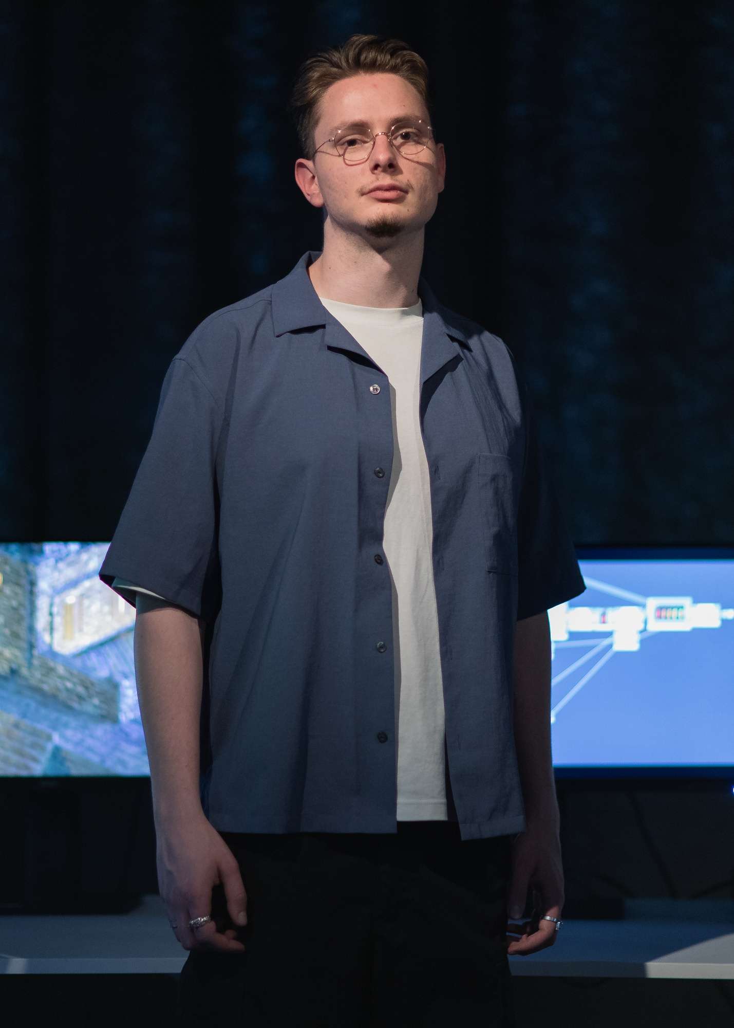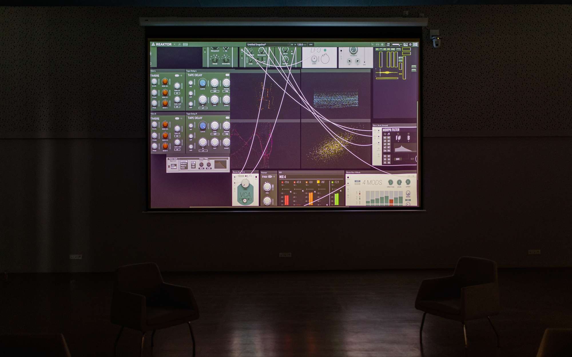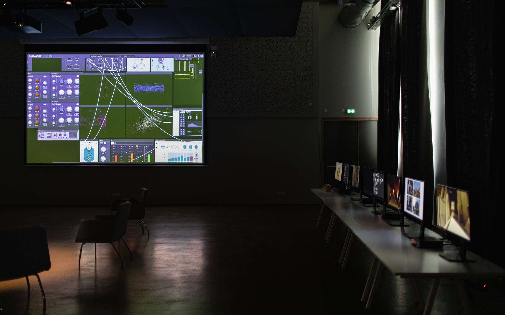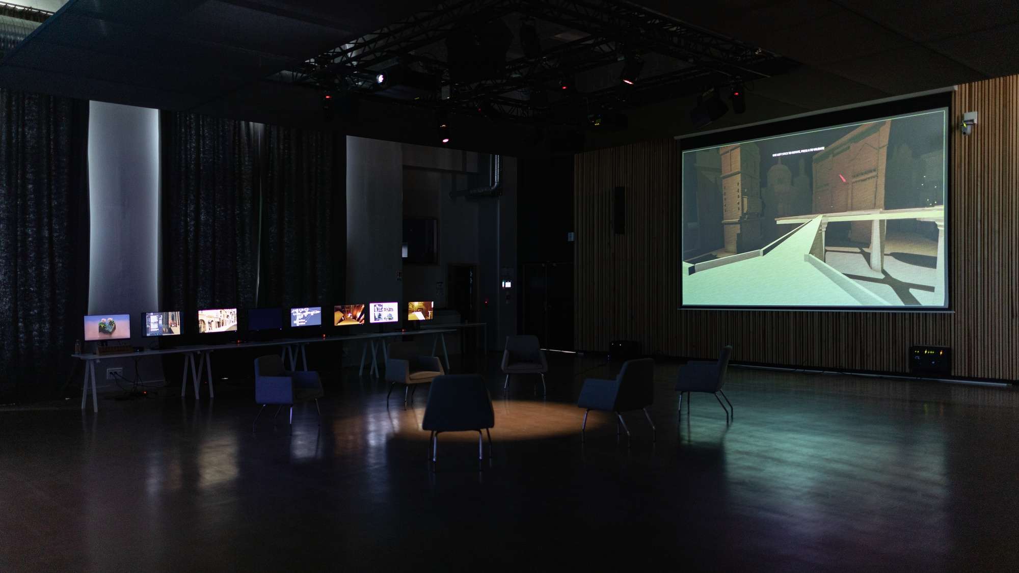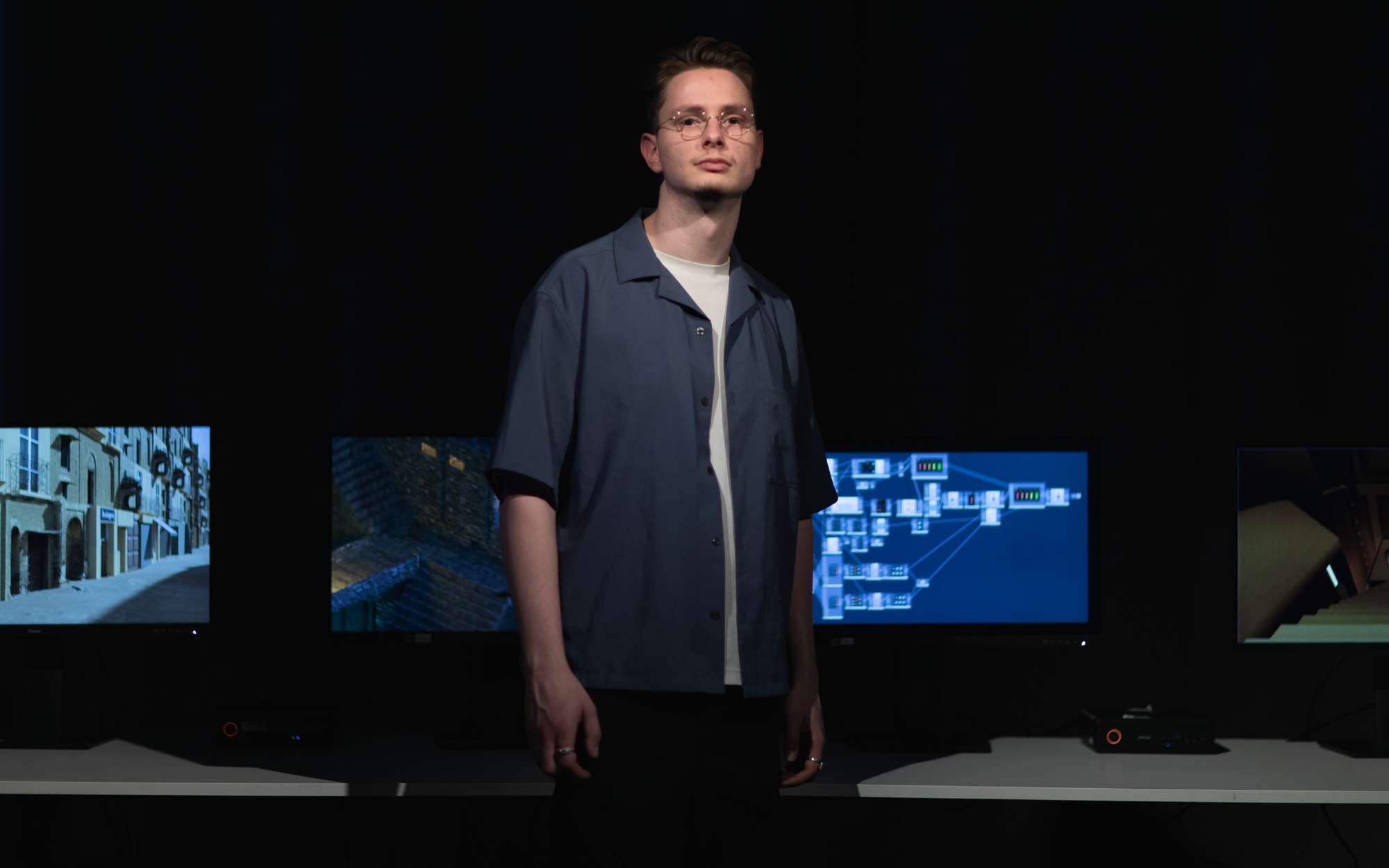 Comment façonner un espace de création venant faire interagir des éléments sans lien direct ? On est ici plongé d'en un environnement architectural que l'on découvre et explore. Il y est possible d'y modifier l'architecture. L'environnement sonore change en fonction de choix architecturaux. Cette double interaction entre création musicale et architecturale est la racine même de ce projet. Mes choix sonores influencent mon architecture et vice-versa. Ce projet est à la frontière de l'instrument, du jeu vidéo et de l'outil de création visuel. Son flou de statut permet un changement dans la manière de moduler des sonorités et de créer des espaces.