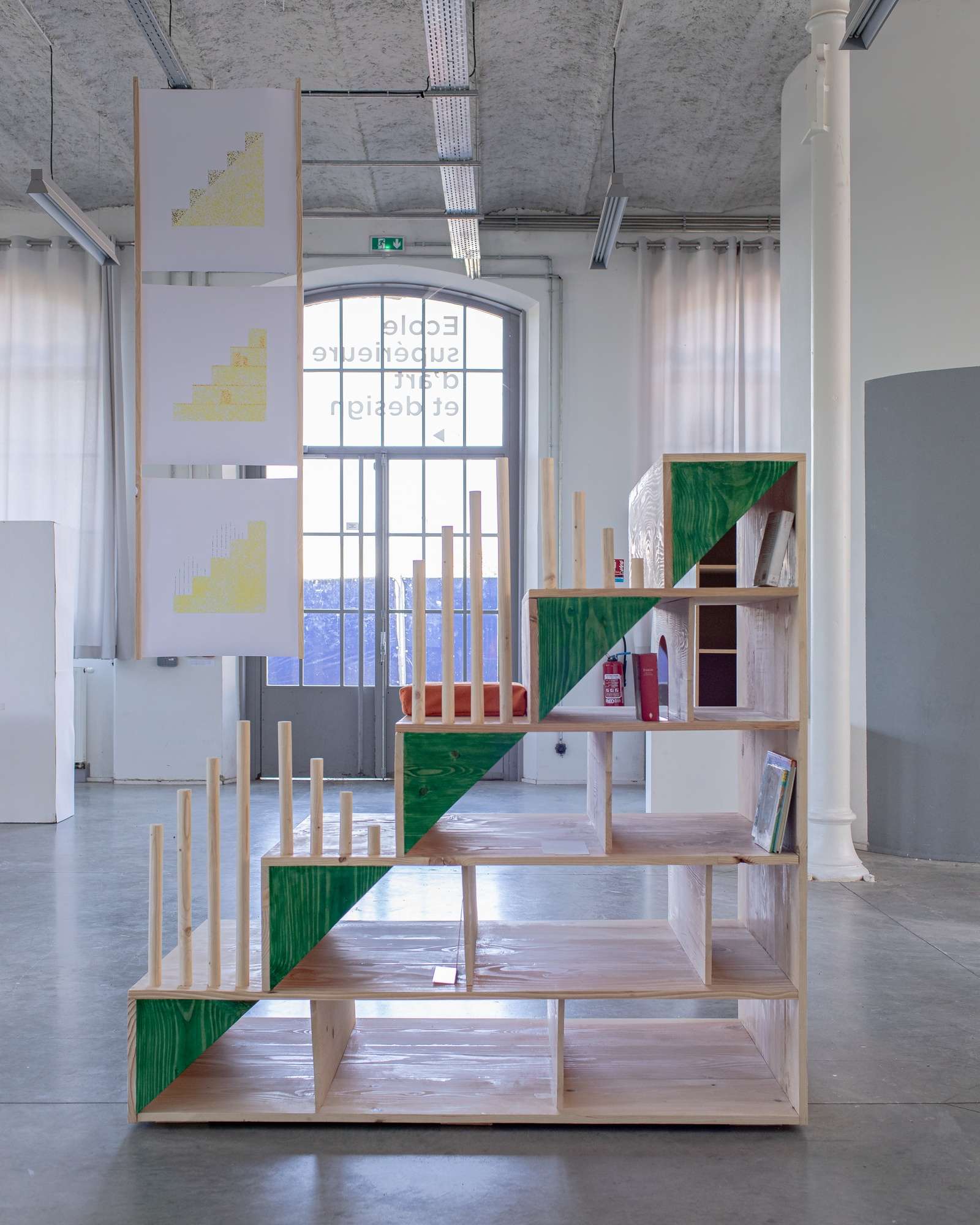 Le vocabulaire formel — rond, carré, triangle, rectangle — est volontairement élémentaire. Il évoque les premiers apprentissages, les bases du dessin, les jeux de construction. Cette simplicité rend la lecture de l’objet accessible à chacun, comme une grammaire commune du sensible. Ils esquissent une autre manière d’habiter la bibliothèque : comme un espace de passage et d’ancrage, de solitude choisie et de rencontres silencieuses — un lieu à vivre, à soi et avec les autres.