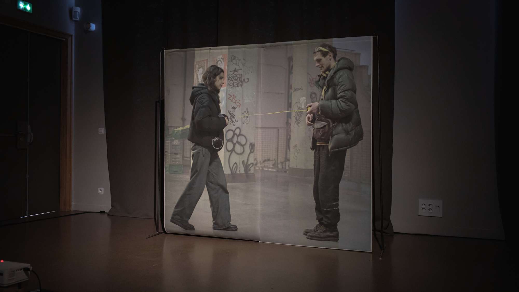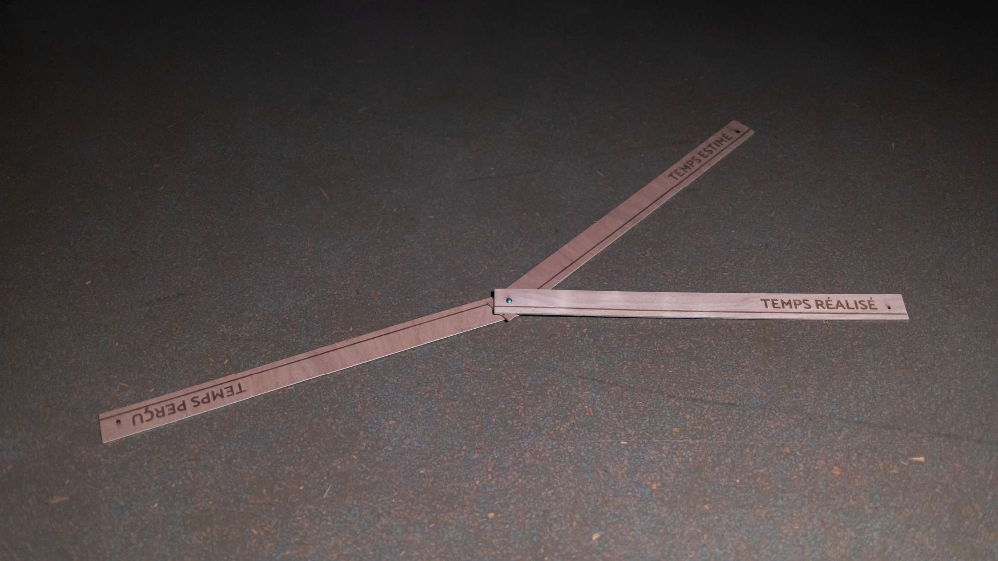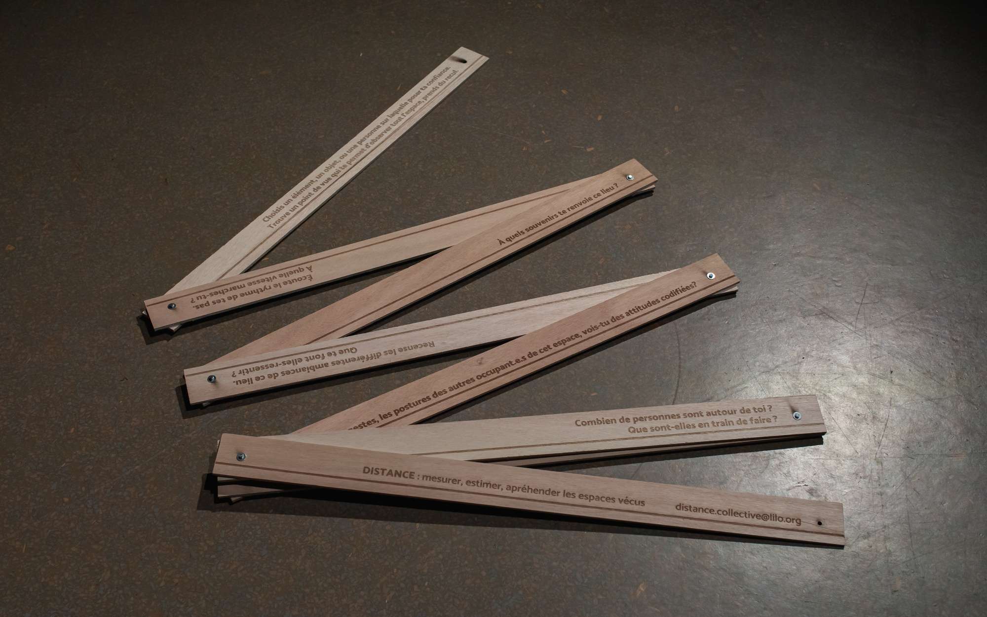 Un outil est présent sur le sol. Détournant le mètre pliant, cet objet, à la fois instrument de mesure et médium de parole, invite chacun à donner son unité, à partager ses perceptions et récits. Il deviendra un support d’échange et de collecte dans l’espace public.