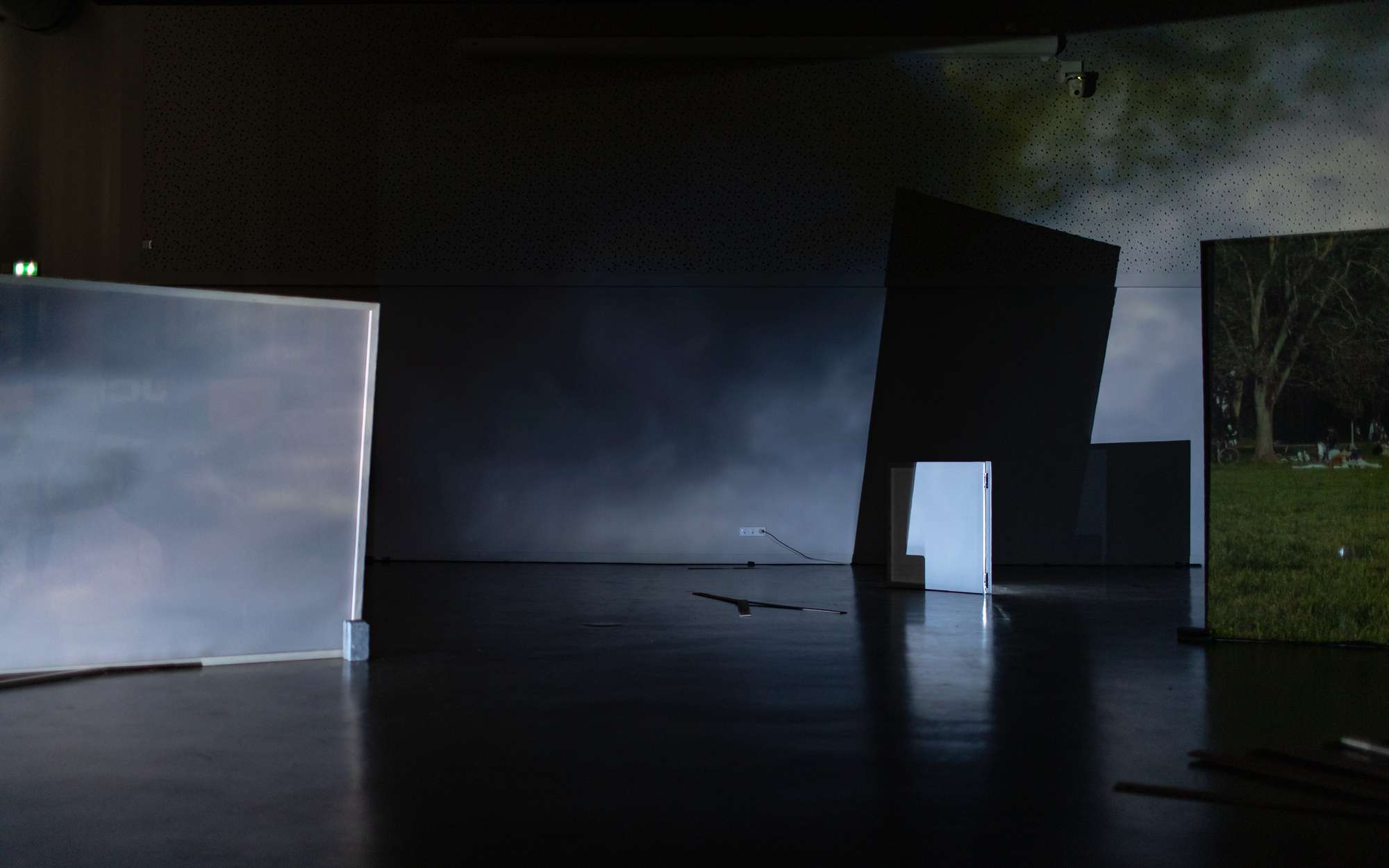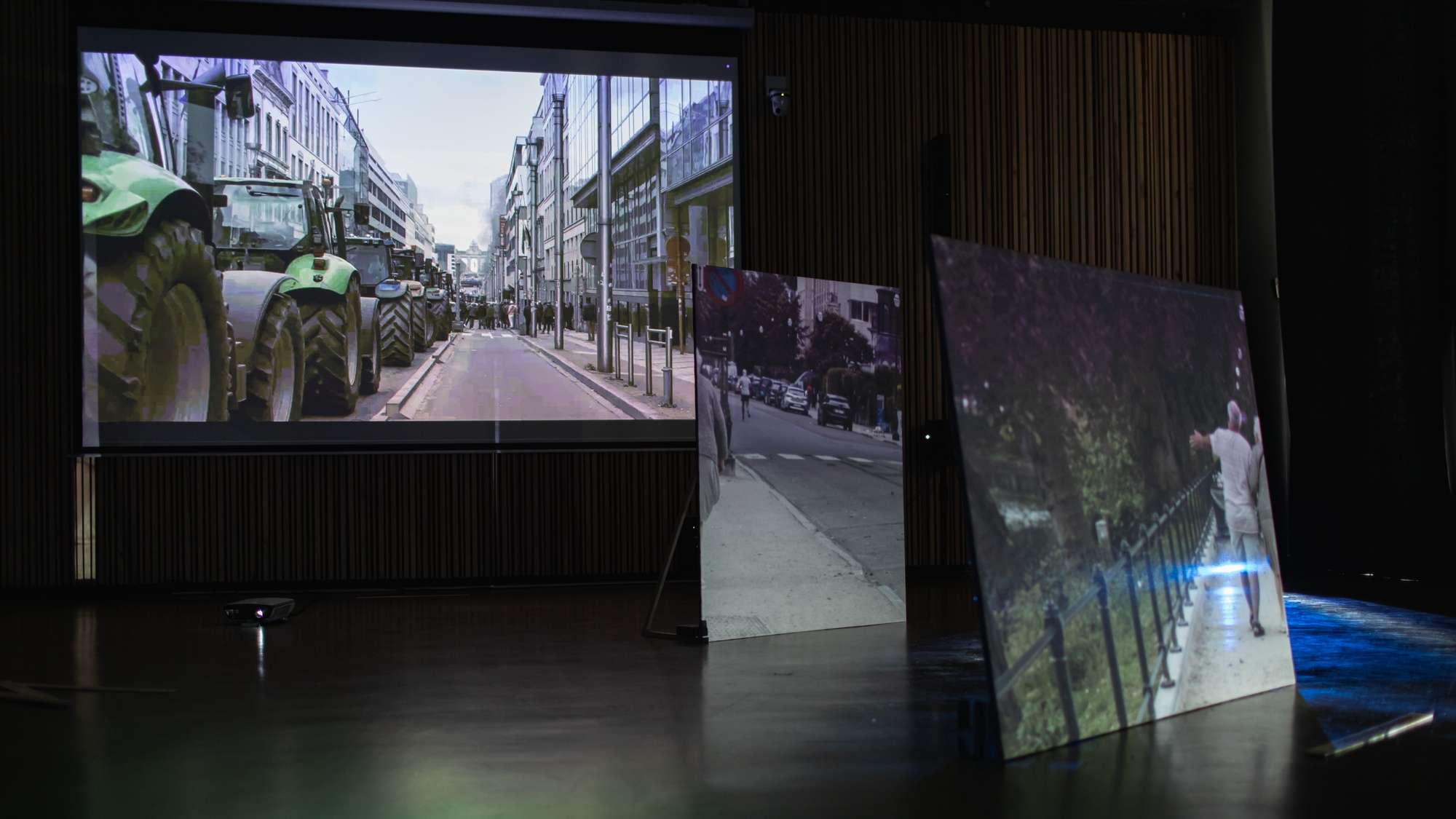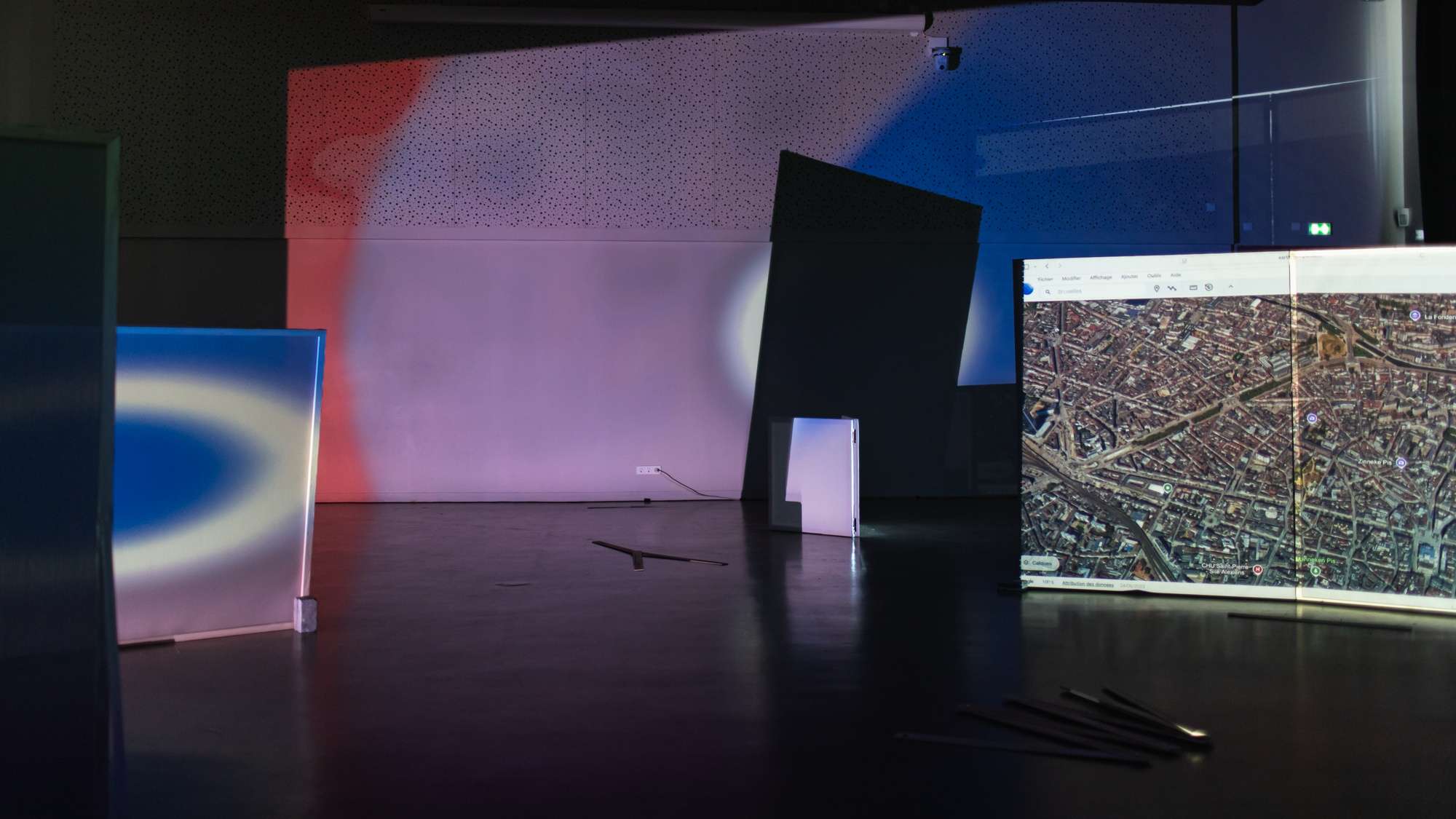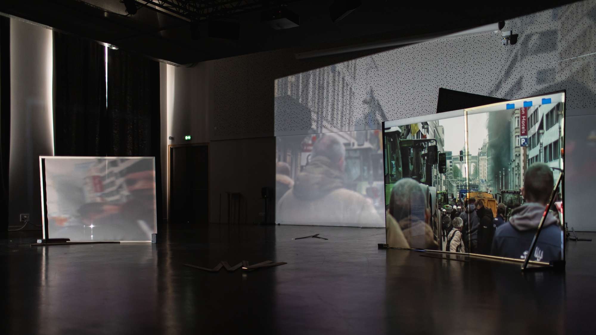 Dans l’espace, cinq écrans s’activent et se désactivent au rythme d’une traversée de Bruxelles. L’installation invite à se déplacer entre différentes couches de l’espace : matériel, numérique, mental et social. Elle met en scène une journée fictive construite à partir de fragments de récits, d’images, de sons, comme une tentative de recomposer une géographie sensible. Chaque écran représente une dimension traversée, ensemble ils forment un paysage composite de l’expérience vécue. Ce travail s’ancre dans une exploration intime, mais propose un protocole adaptable à d’autres villes et d’autres vécus, invitant un questionnement sur l’expérience sensible de la ville.