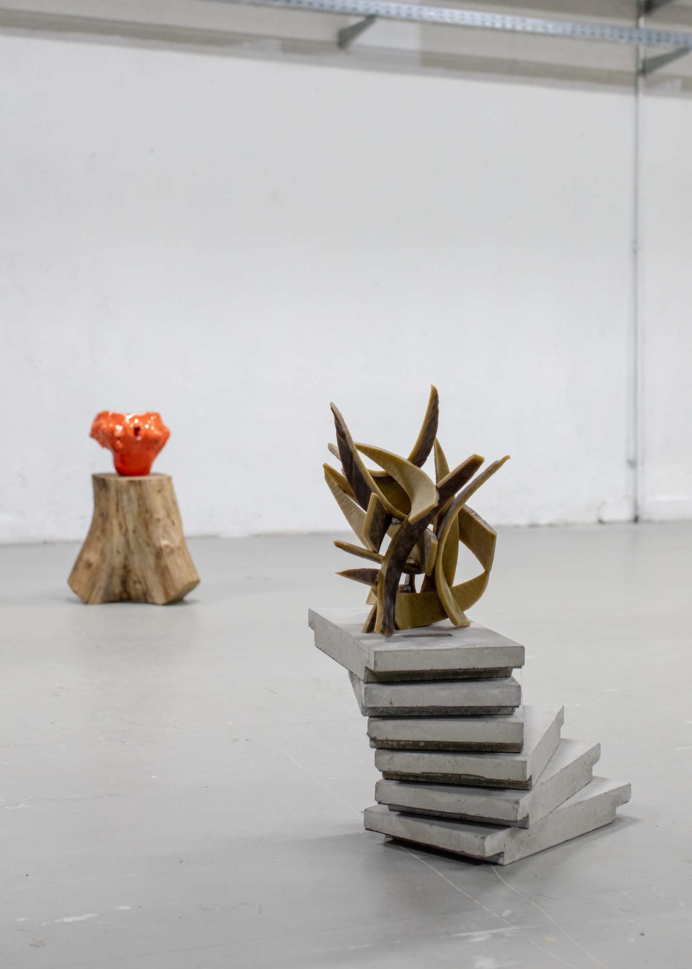 L'idée est d'approfondir les gestes fondamentaux des artsplastiques : découper, coller, mettre en équilibre. Ces sculptures sontmajoritairement réalisées en grès émaillé, elles dialoguent avec d’autresmatières comme l’encre offset, le ciment ou le plexiglass.