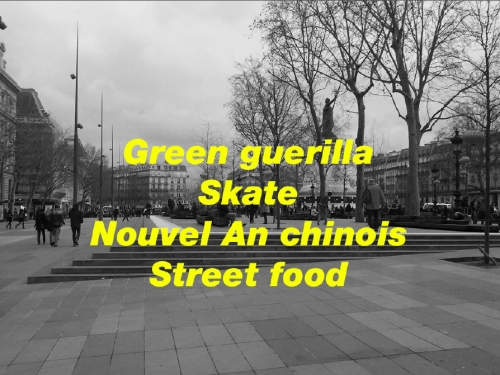 Nous avons passé une journée complète ensuite. Nous avons pu observer les scènes suivantes : green guerilla, skate-board, nouvel an chinois, street food, cause animale, cours de tango, retransmission TV du championnat NBA par Nike, départ de randonnée en roller, manifestation en soutien aux Kurdes d'Irak, Pro-Gbagbo, bataille de polochons, cornemuse, restos du coeur, etc.