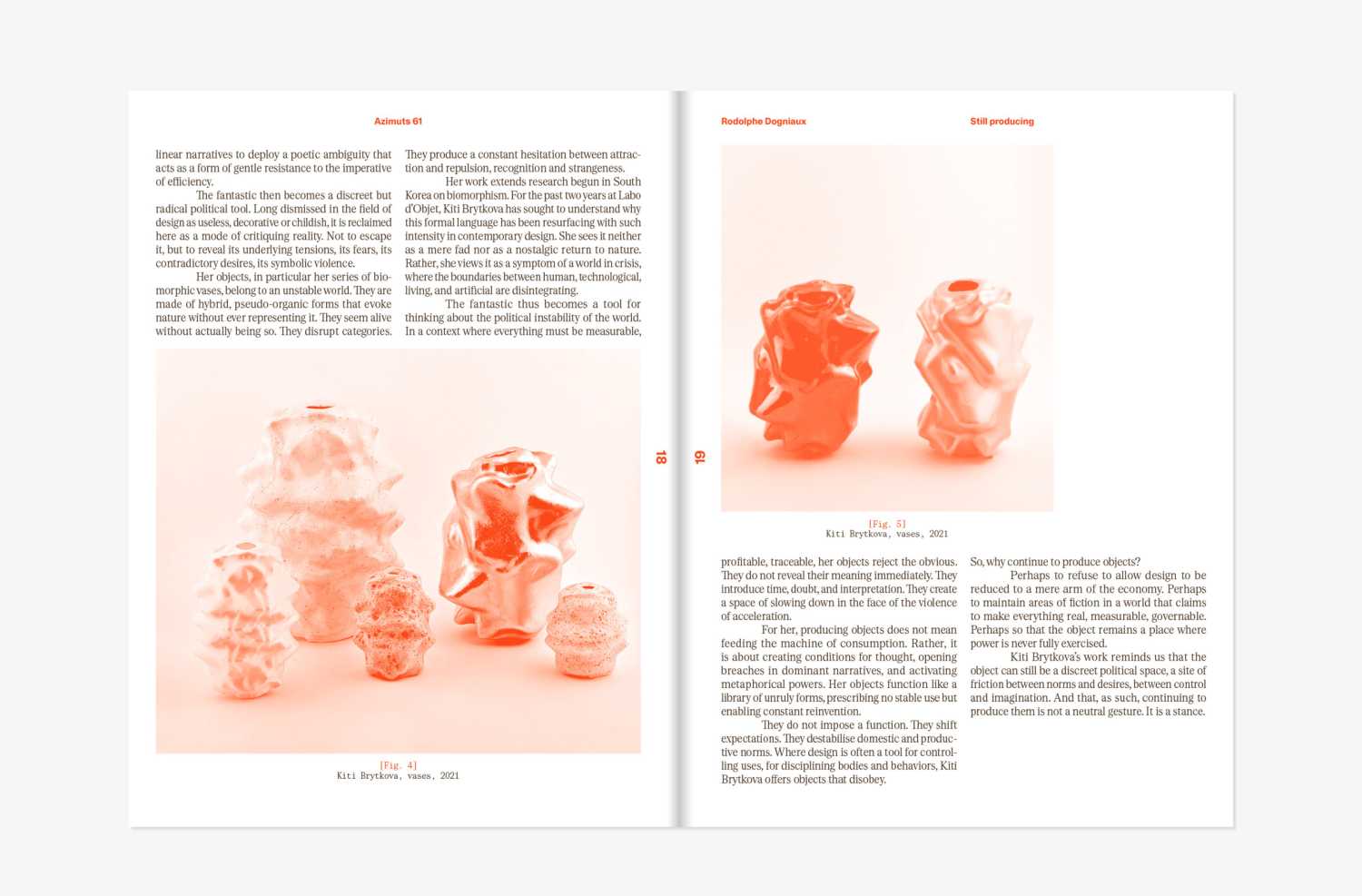 The theme of Azimuts issue 61 was born within the Labo d’Objet (Object Lab), the research labora- tory of the École supérieure d’art et design de Saint-Étienne (Higher School of Art and Design). We are five designers, Elen Gavillet, Marie-Aurore Stiker-Metral, Grégory Granados, Ekatarina “Kiti” Brytkova and Rodolphe Dogniaux. Since our early days as students, a discreet yet persistent question has followed us: why continue to create objects?