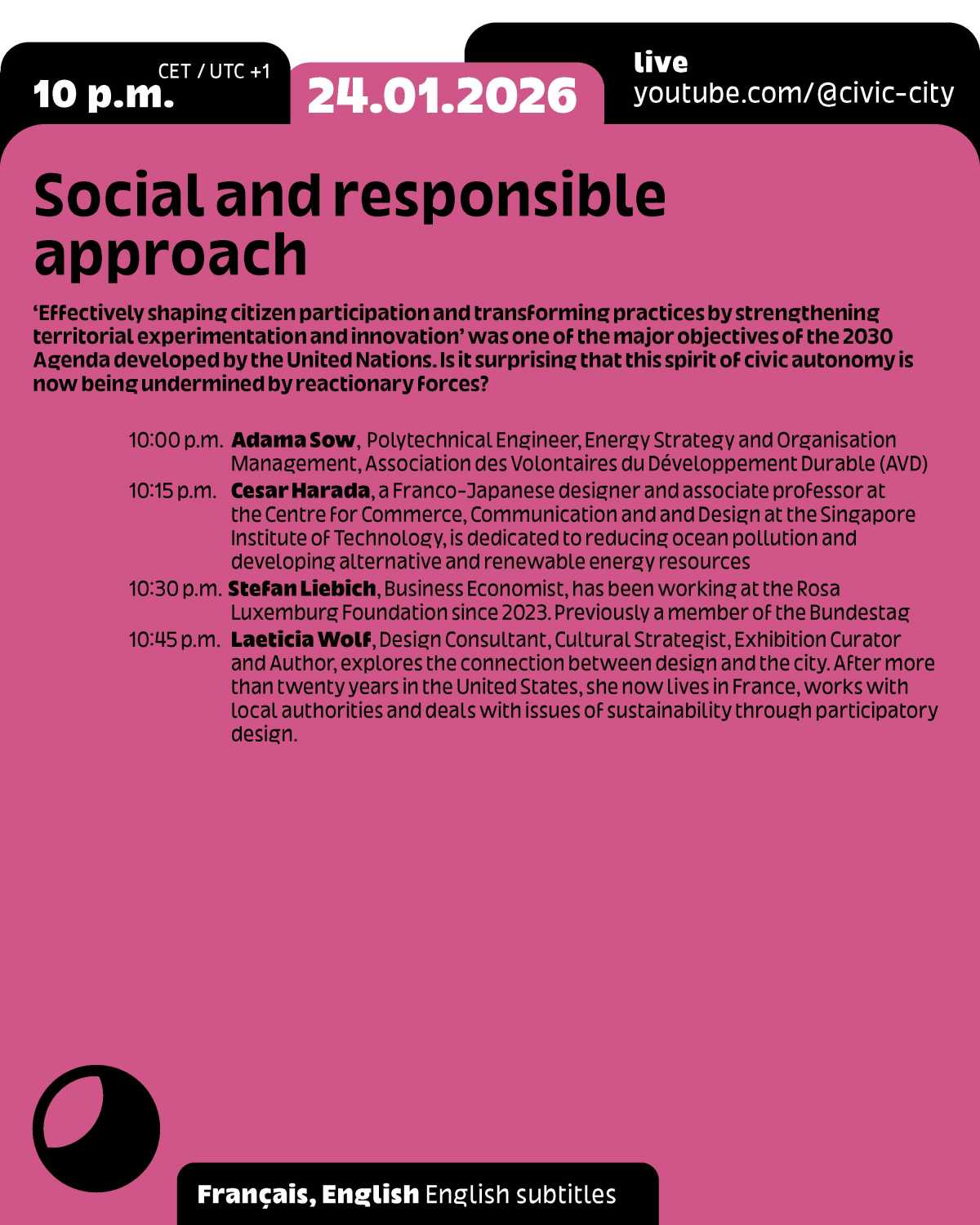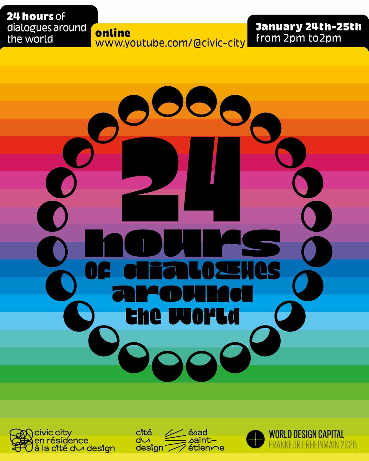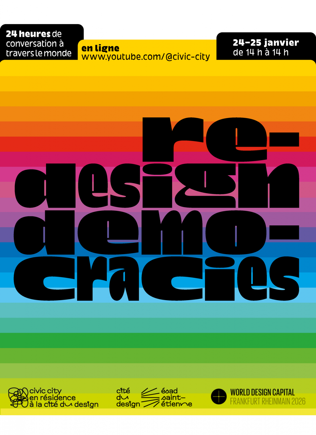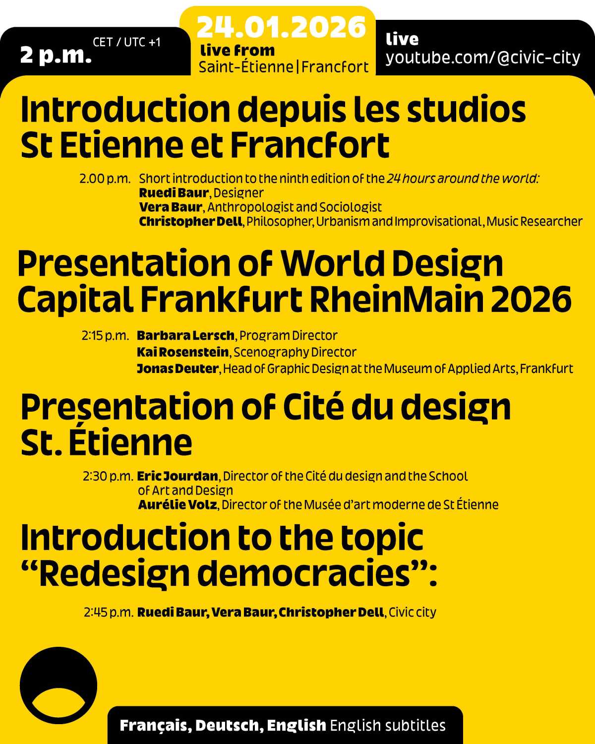 This event is part of the programme for Frankfurt RheinMain, World Design Capital 2026 and Ruedi and Vera Baur’s residency "Civic City at the Cité du Design", of which it is the first public expression. It is also the 9th edition of the programme "24 Hours of Conversation Around the World" produced by Civic City.