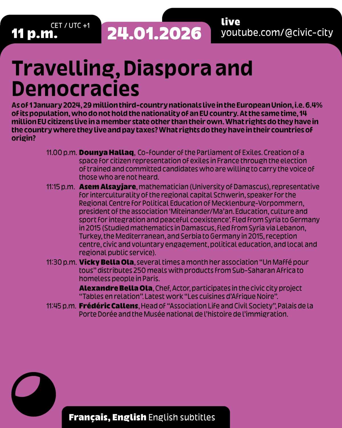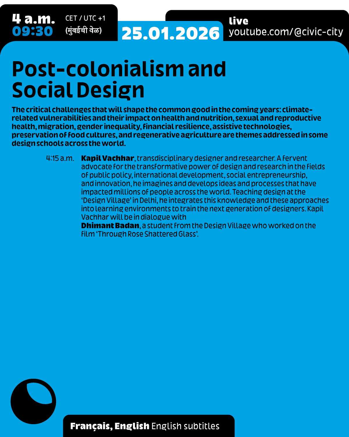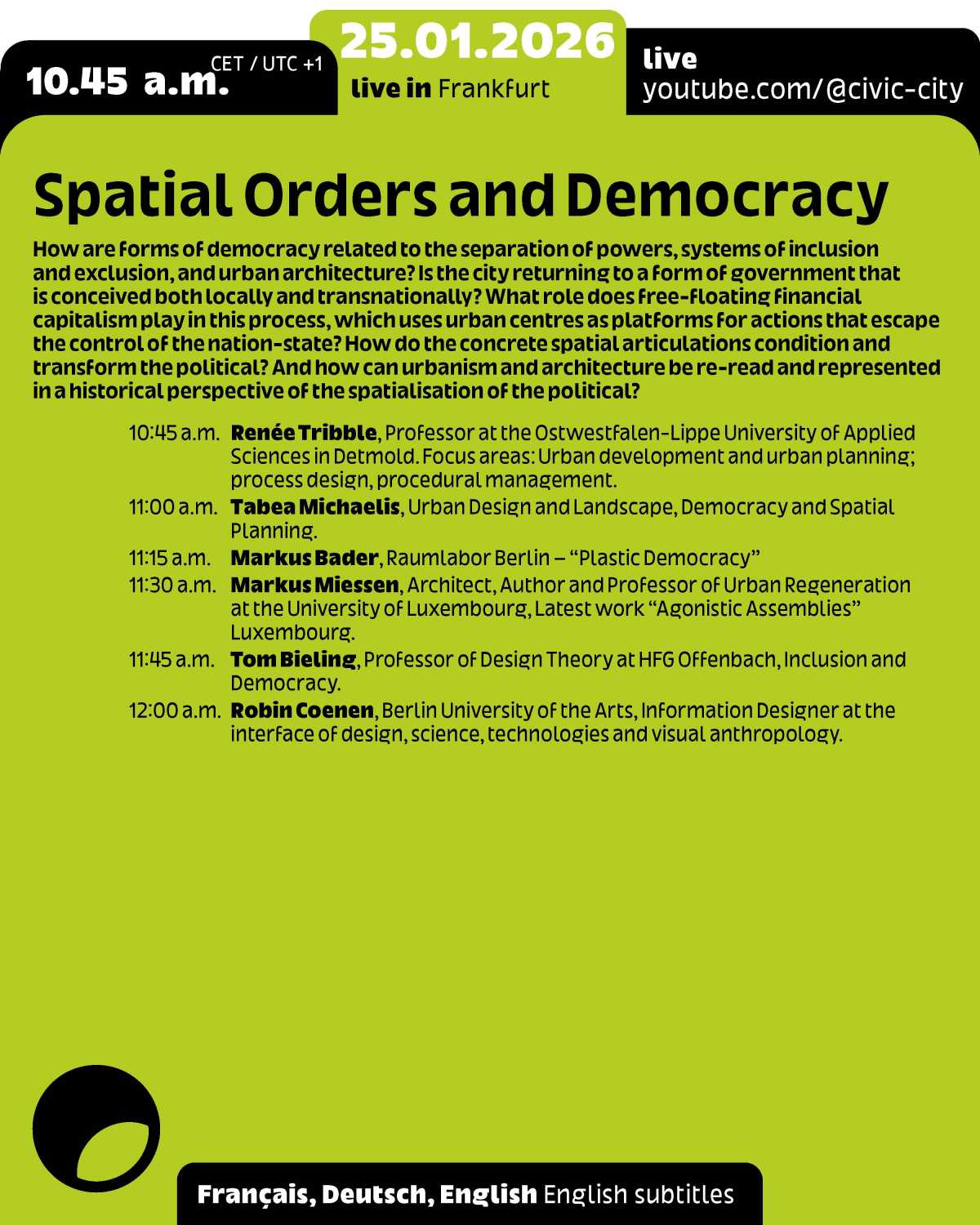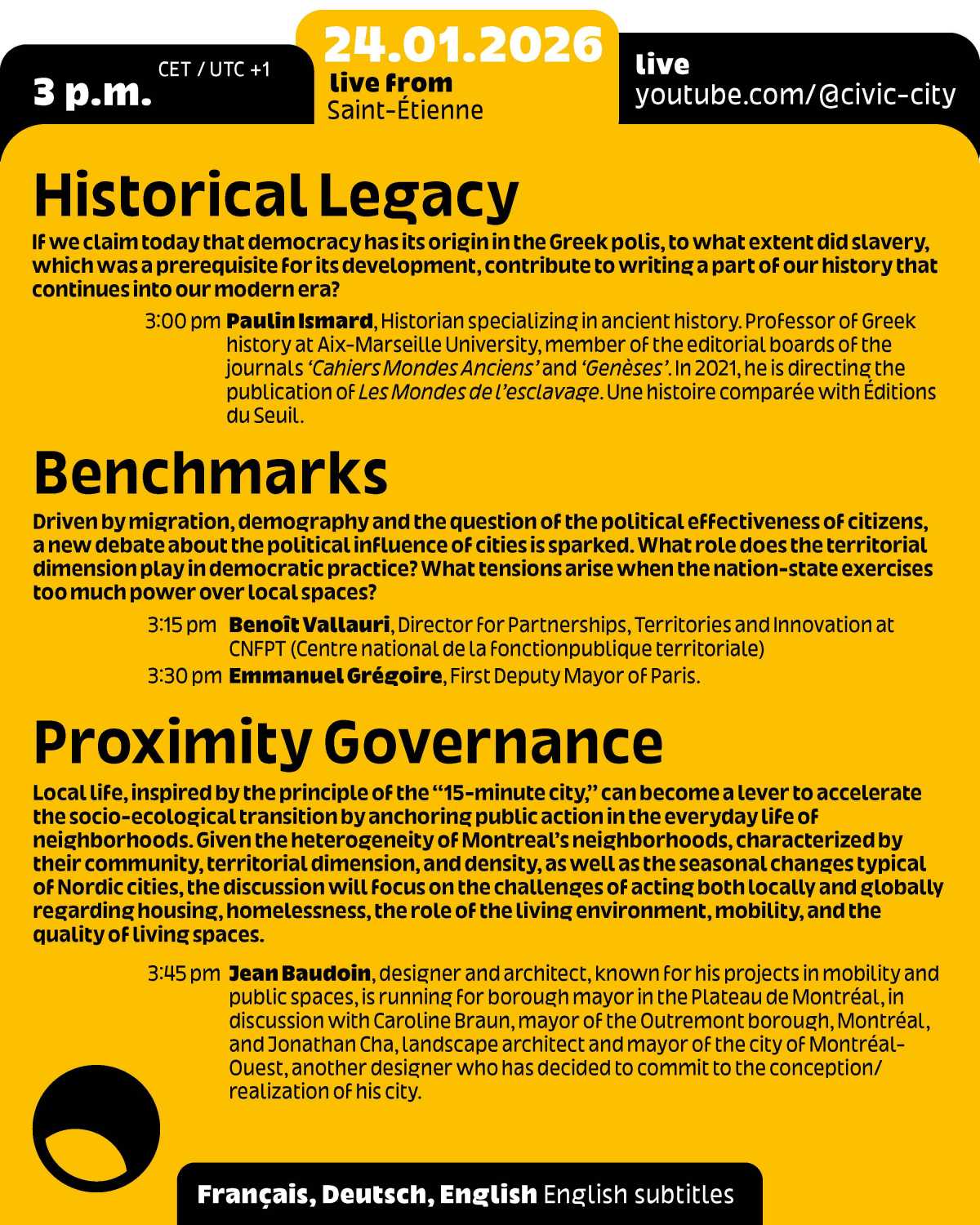 This event is part of the programme for Frankfurt RheinMain, World Design Capital 2026 and Ruedi and Vera Baur’s residency "Civic City at the Cité du Design", of which it is the first public expression. It is also the 9th edition of the programme "24 Hours of Conversation Around the World" produced by Civic City.