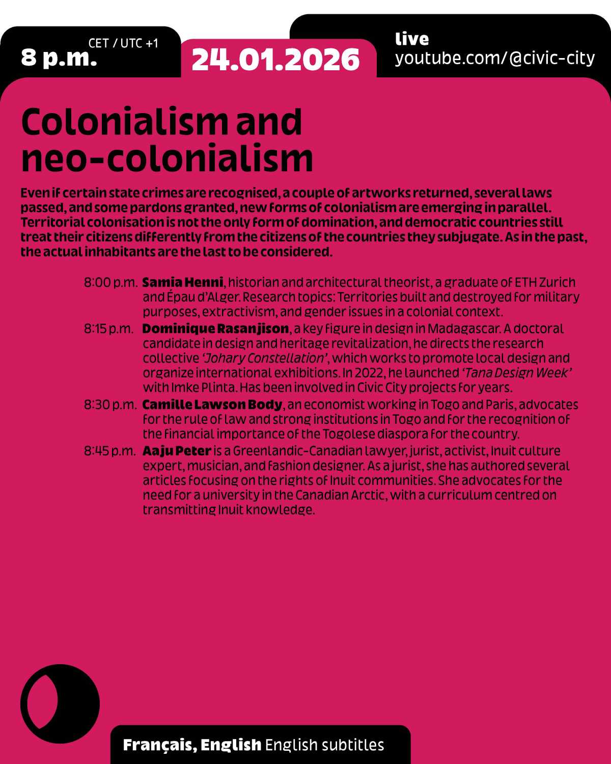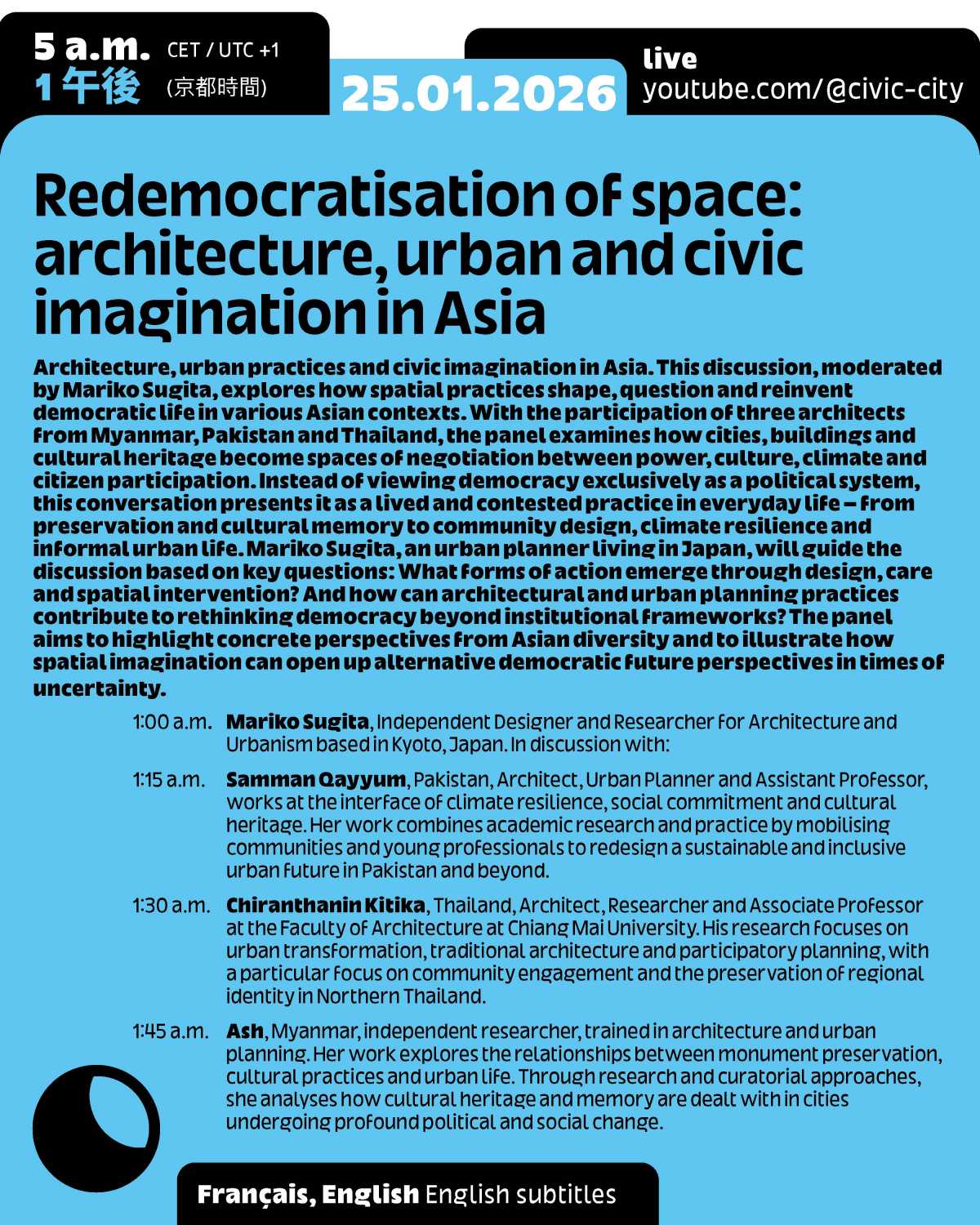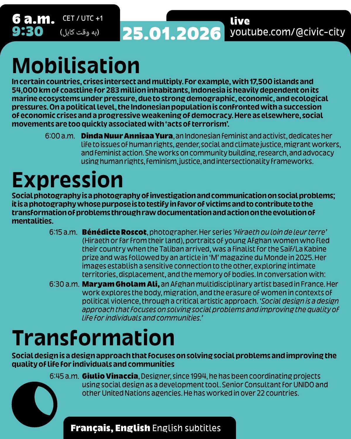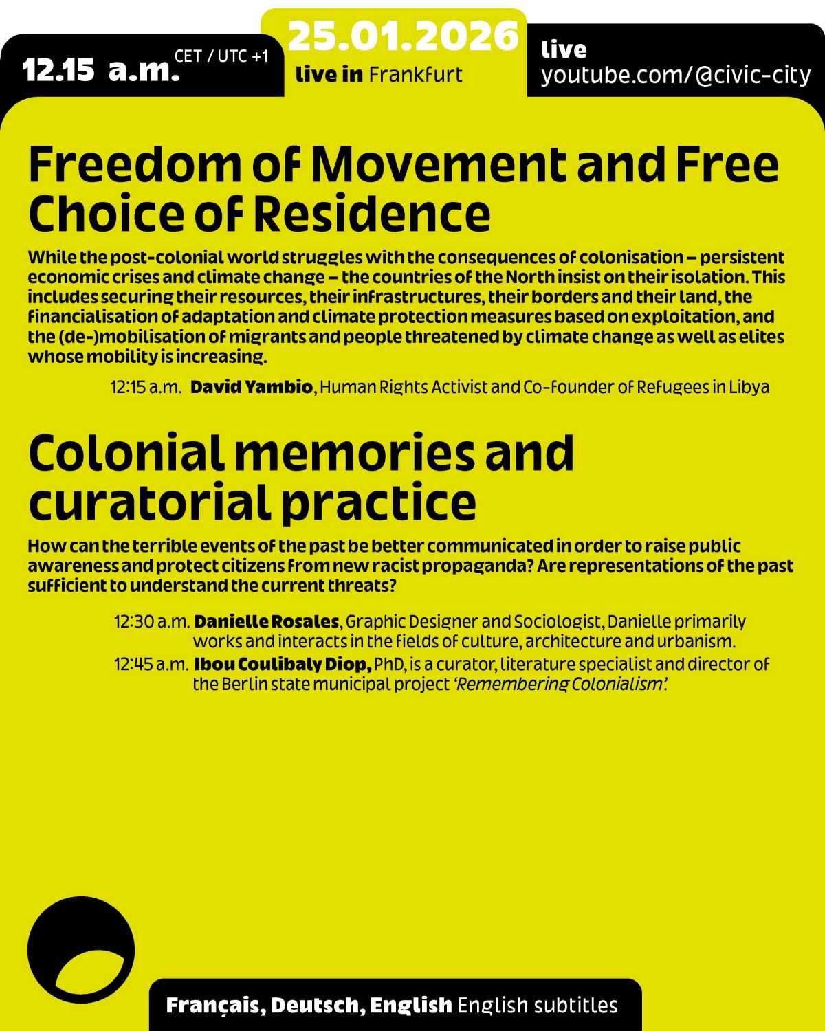 This event is part of the programme for Frankfurt RheinMain, World Design Capital 2026 and Ruedi and Vera Baur’s residency "Civic City at the Cité du Design", of which it is the first public expression. It is also the 9th edition of the programme "24 Hours of Conversation Around the World" produced by Civic City.