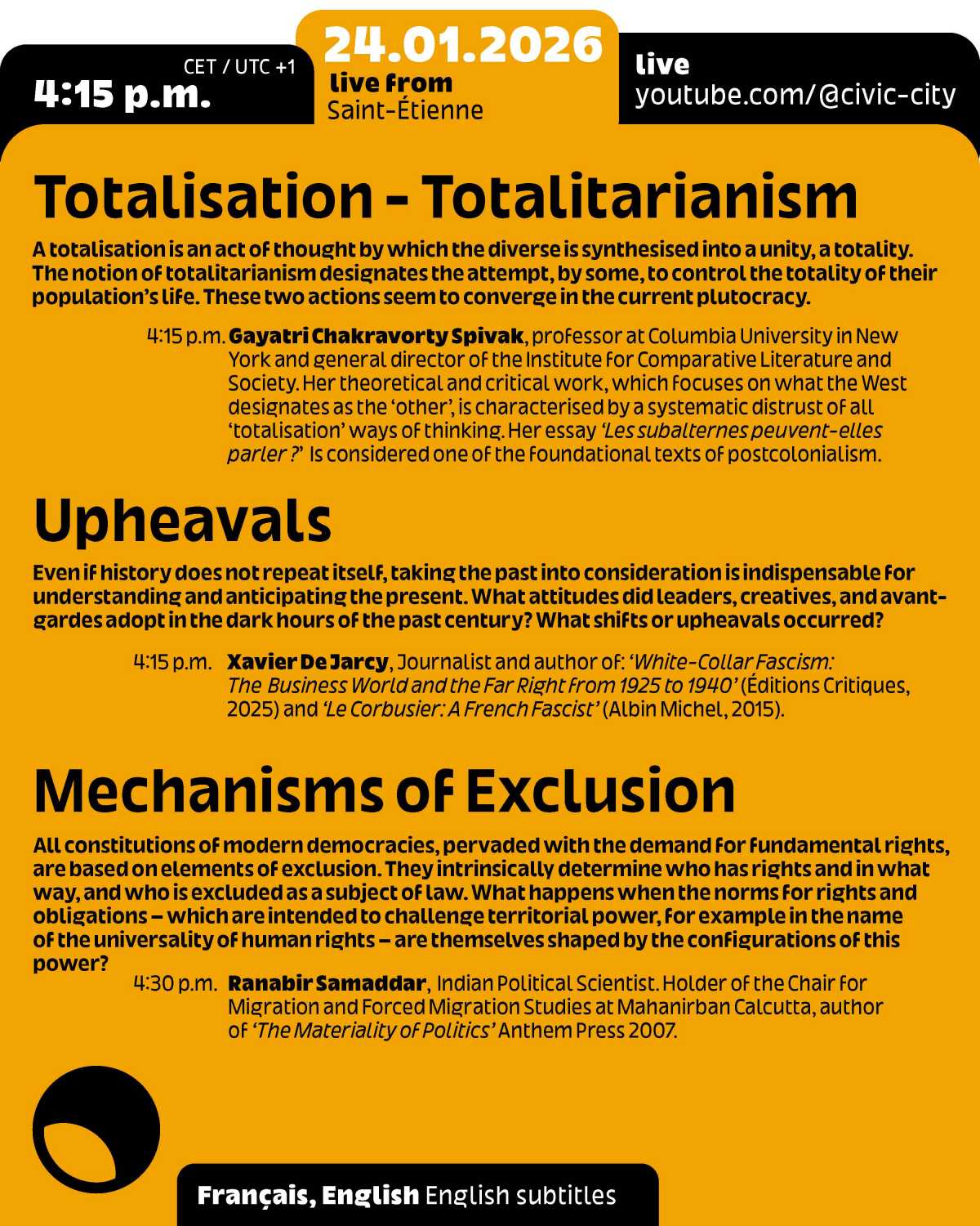 In total, 96 dialogues with guest speakers will be held over the course of 24 hours, at a rate of 15 minutes per speech, following the different time zones. From the concept of democracy to the reality of today’s democratic emergencies, these exchanges will take us on a journey around the world, exploring historical and contemporary notions of democracy and proposals for rethinking it.