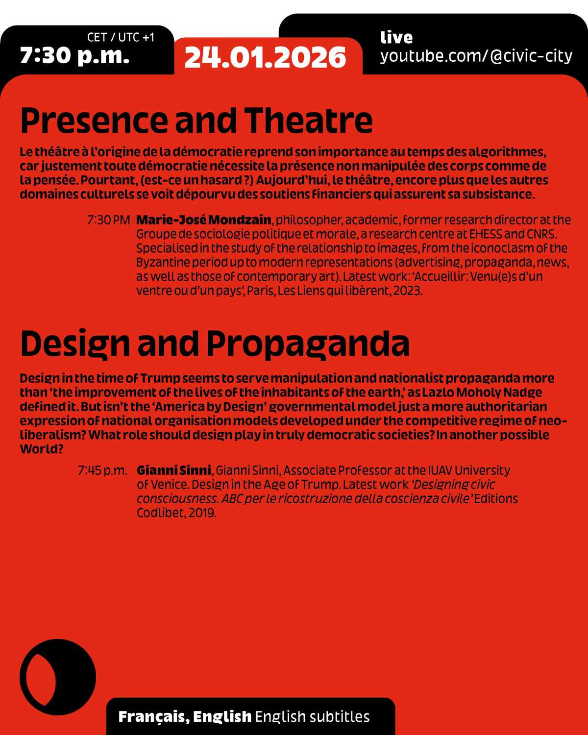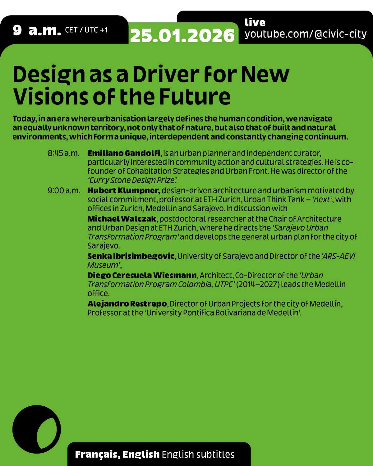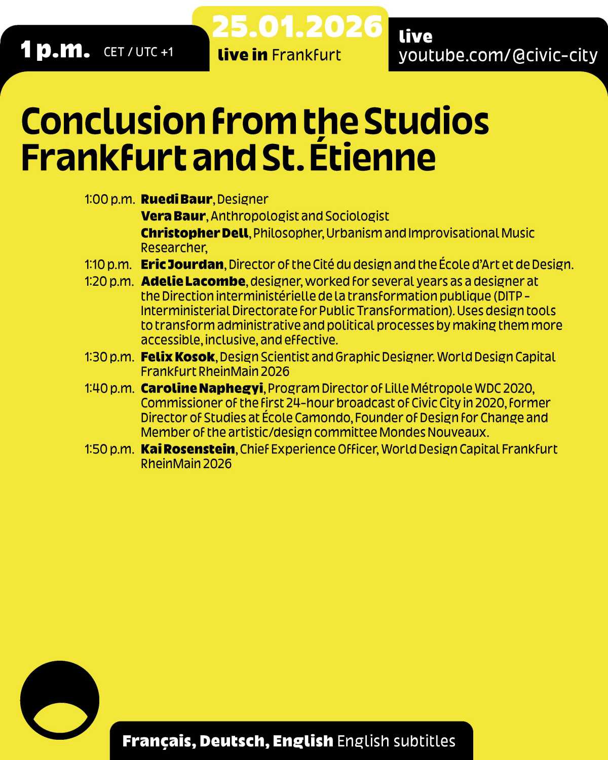 The event will be hosted by Ruedi Baur from the Cité du Design, with a live link to Frankfurt, the 2026 World Design Capital.