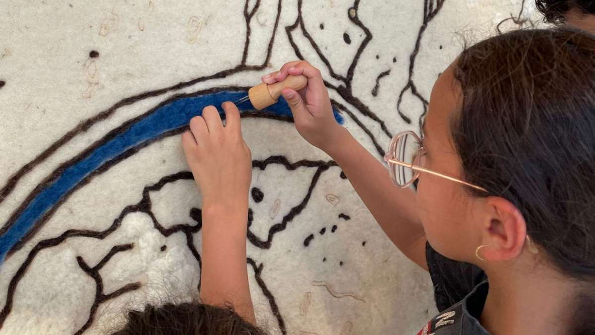 L’atelier proposait de réaliser un tableau collectif inspiré d’un paysage pastoral aux abords de Saint-Étienne. Les participants ont donc appris à feutrer la laine à l’aiguille tout en créant une œuvre collective. Ils étaient guidé par les formes déjà dessinées sur le tableau de laine ainsi que par un numéro qui renvoyait à la couleur à utiliser.