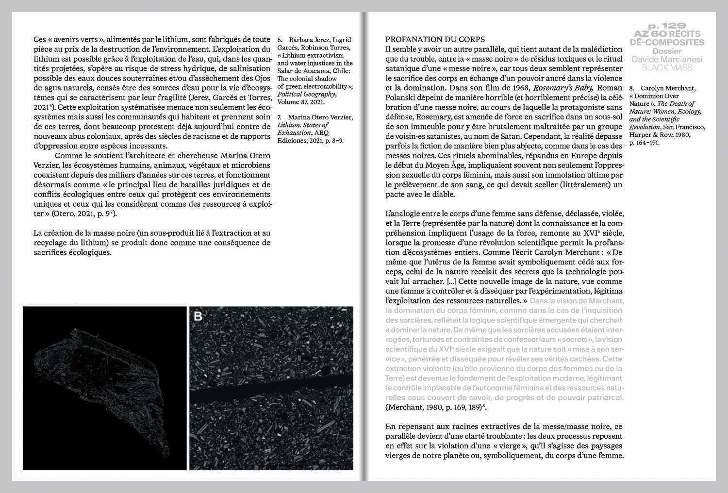 Avec son article « Black mass » (« Batteries Active Materials Mixture »), Davide Marcianesi, artiste interdisciplinaire et chercheur, s’intéresse à la poudre toxique – et composite – obtenue lors du processus de recyclage ou de valorisation des batteries (lithium-ion) : une mixture chimique et culturelle, invisible et dangereuse, où les corps humains et non humains composent avec des histoires et des matériaux modernes dans laquelle la nature se réduit en ressource exploitable.