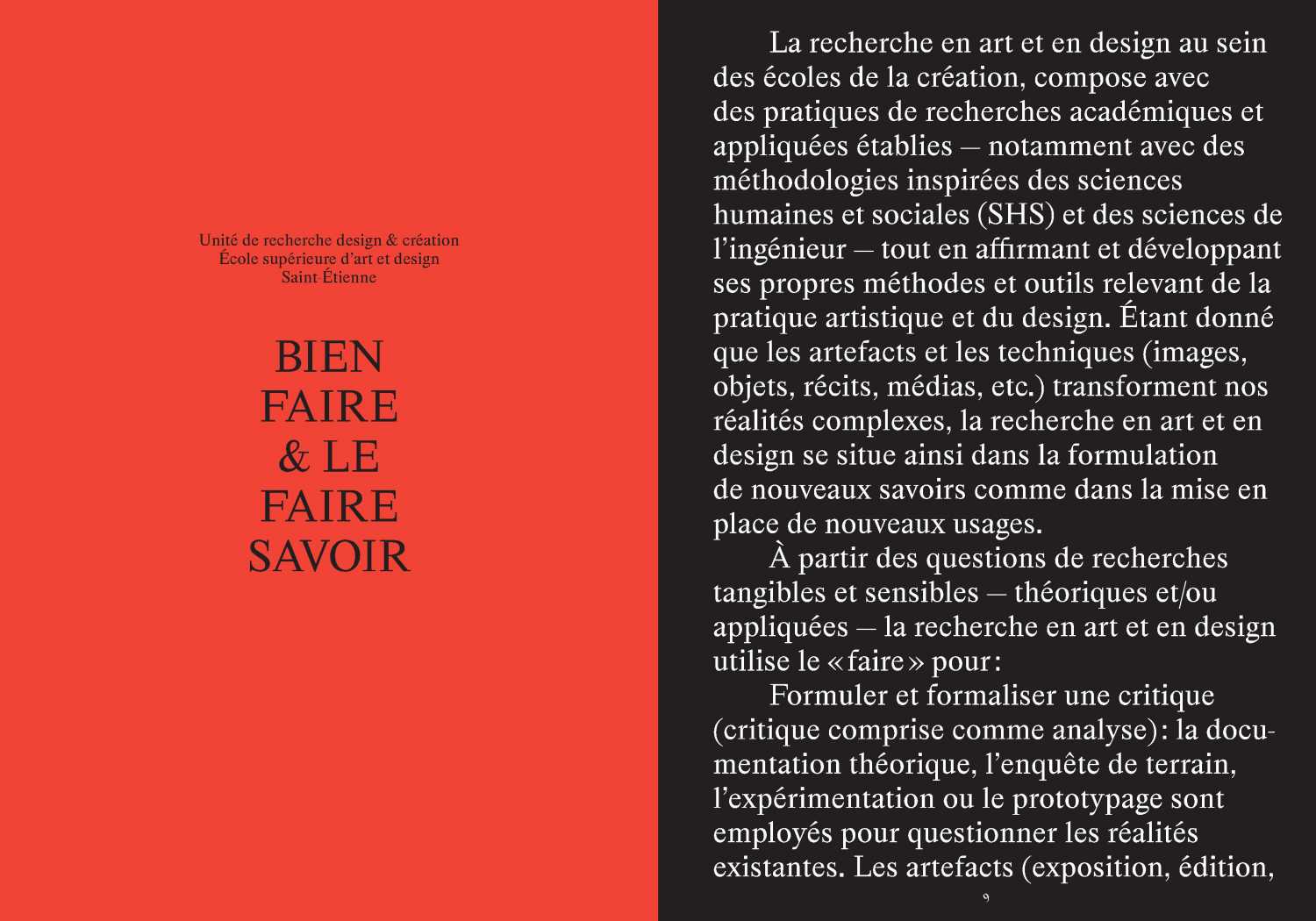 La recherche en art et en design au sein des écoles de la création compose avec des pratiques de recherches académiques et appliquées établies — notamment avec des méthodologies inspirées des sciences humaines et sociales (SHS) et des sciences de l’ingénieur — tout en affirmant et en développant ses propres méthodes et outils relevant de la pratique artistique et du design. Étant donné que les artefacts et les techniques (images, objets, récits, médias, etc.) transforment nos réalités complexes, la recherche en art et en design se situe ainsi dans la formulation de nouveaux savoirs comme dans la mise en place de nouveaux usages.