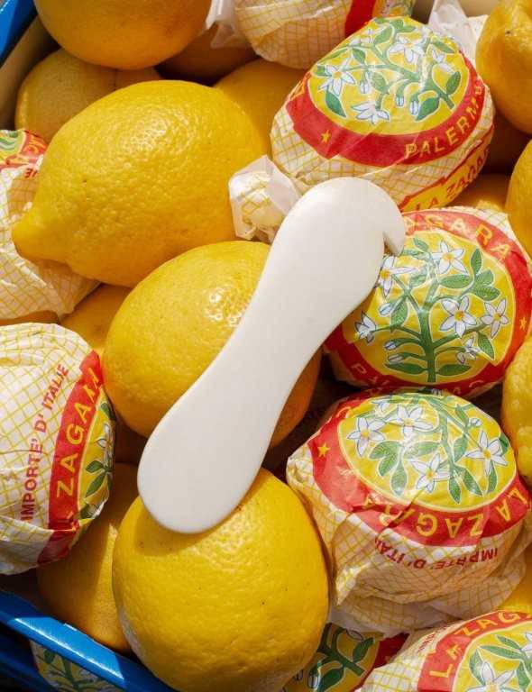 C’est l’outil indispensable pour éplucher une orange (ou tout autre agrume) avec élégance et la déguster comme il se doit. On utilise d’abord le crochet pour entailler l’écorce à partir du sommet du fruit, en dessinant quatre quartiers. Puis on retire la peau avec le bout rond de l’éplucheur, qui servira aussi à éliminer le mésocarpe, la peau blanche et amère résiduelle. L’ensemble de ces opérations permet de peler l’orange sans perdre une goutte de son jus, ni abîmer sa sphère parfaite. Il devient alors facile de diviser les tranches afin de profiter de ce fruit d’exception. Fabriqué à la main en os ou en corne de bovin, l’orange peeler, qui nous vient d’Angleterre, résiste au temps et sa matière poreuse se patine joliment au contact des aliments.