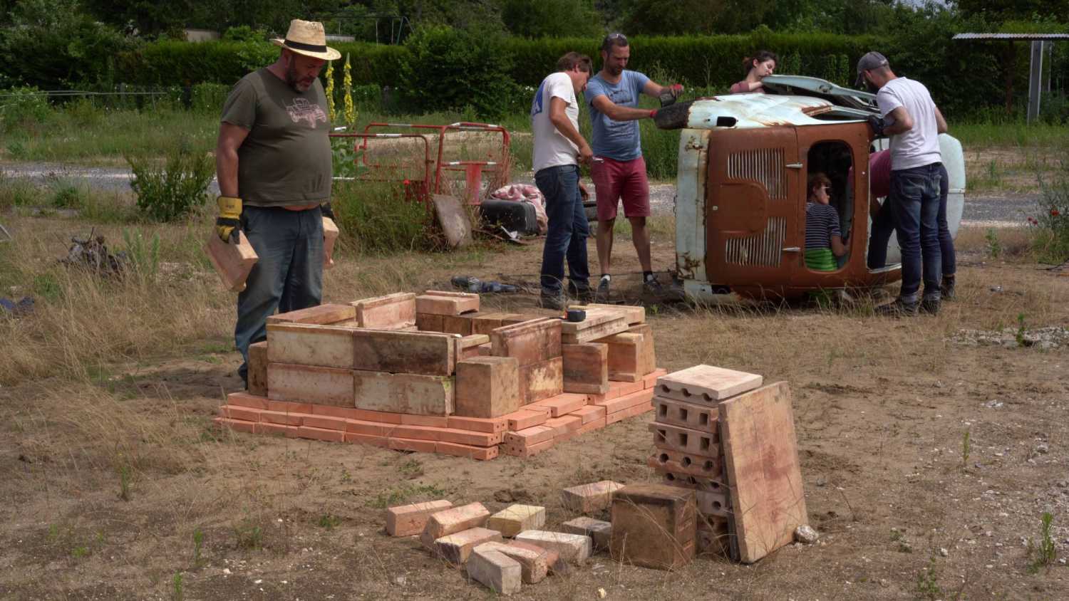 Une carcasse de voiture va trouver une nouvelle fonction, reprendre vie en devenant un four dans lequel seront cuites des pièces en terre. C'est aussi un moment collectif.