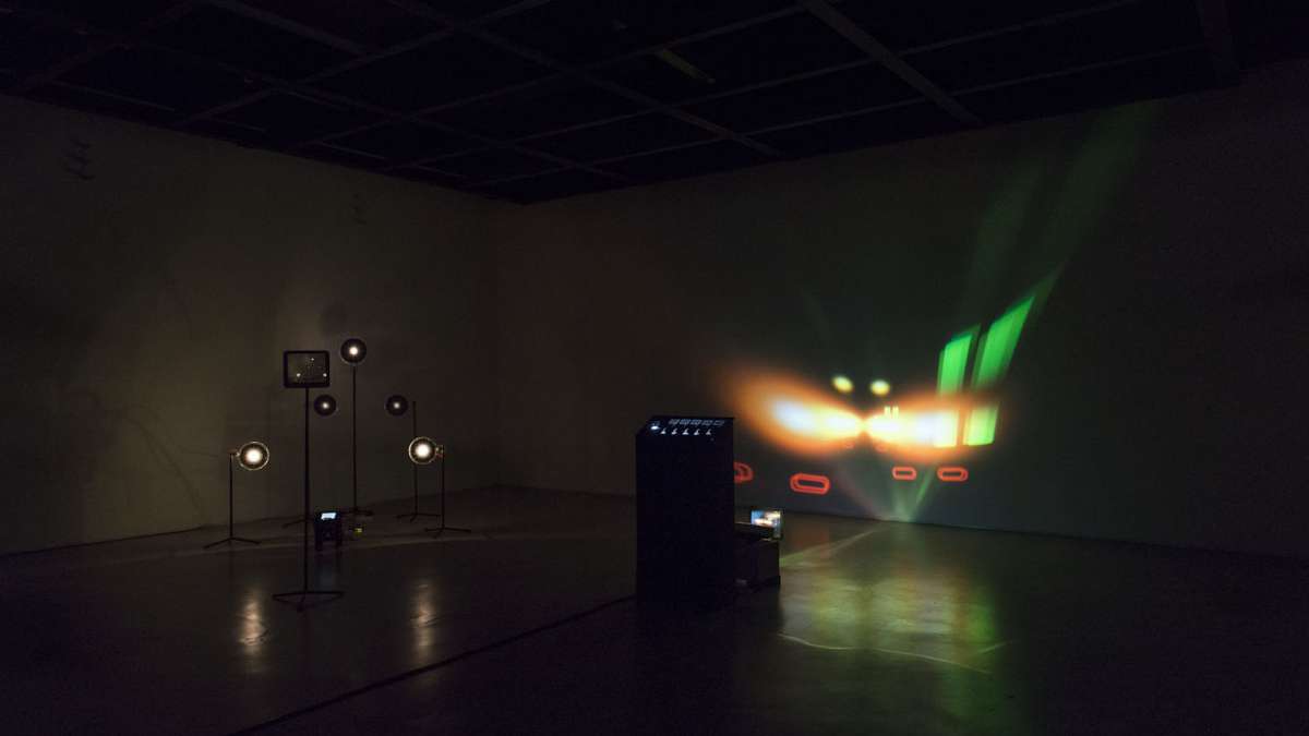 Ensemble de cinq objets motorisés, illustrant l'orchestration de rythmiques lumineuses, par la lecture de partition via processing.