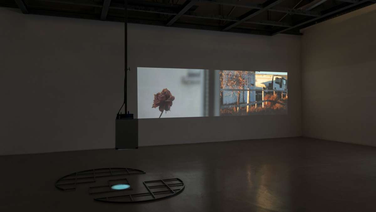 Sur l'un de ces morceaux, est projeté au sol le mouvement rapide et régulier d'une éolienne.