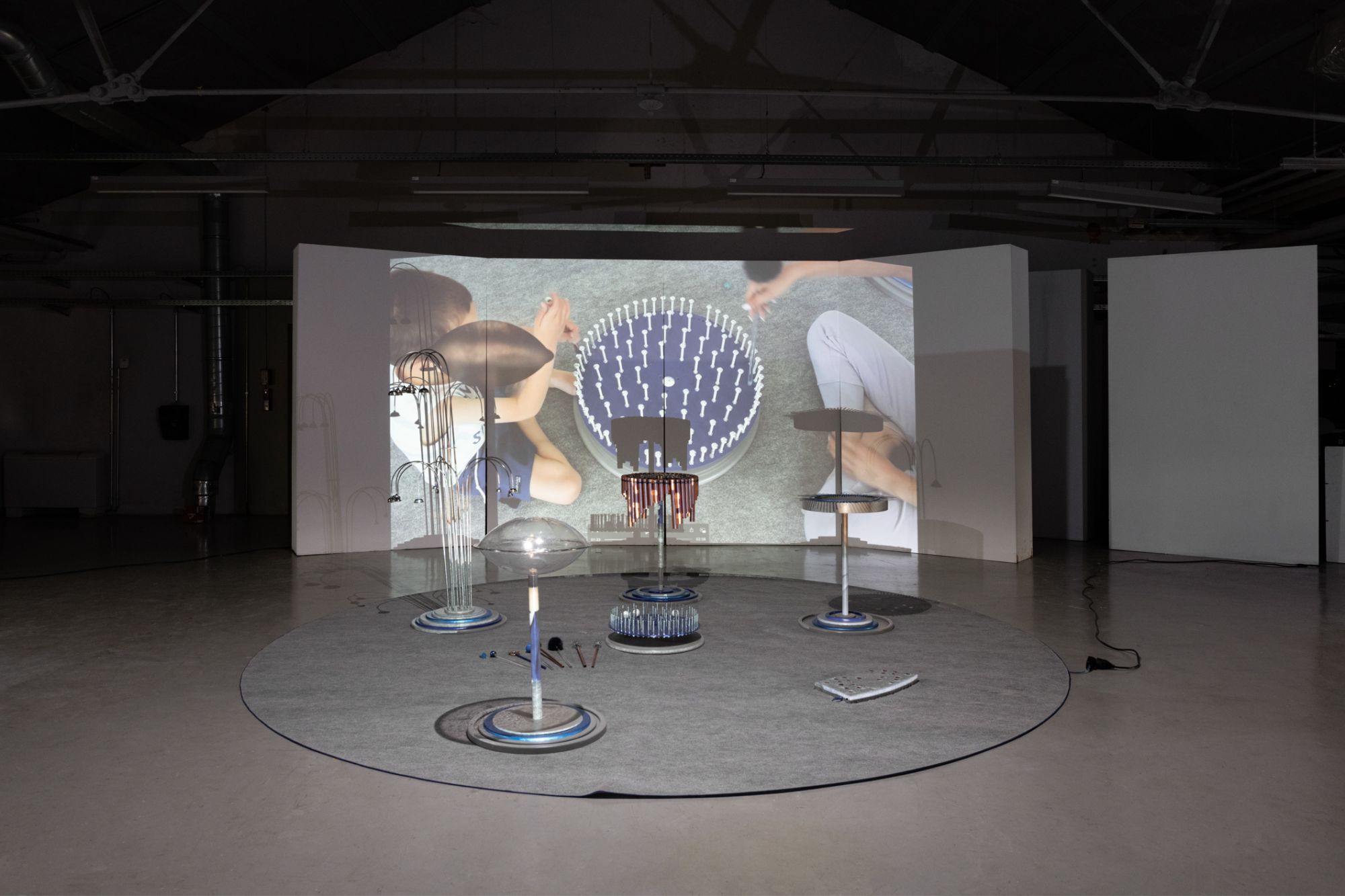 Vers un dialogue se compose premièrement d’un tapis délimitant un repère, une zone de confort, représente l’état, l’endroit symbolique où l’on peut accueillir l’ordinaire, la différence, la concentration et l’évasion. Dans un deuxième temps, différents dispositifs sonores sont positionnés sur ce cercle, les fixes surmontés d’un socle (Tamböa, Kalimba, flûte de pan, arbre à clochette) et les immuables placer au sol (boitier sonore, manège à boule). Chacun de ces dispositifs sonnes ont été sélectionnés et conçut en fonction de leurs vertus (bien-être, réconfort, amélioration de la communication, accroitre la cohésion de groupe, encourager la créativité.)