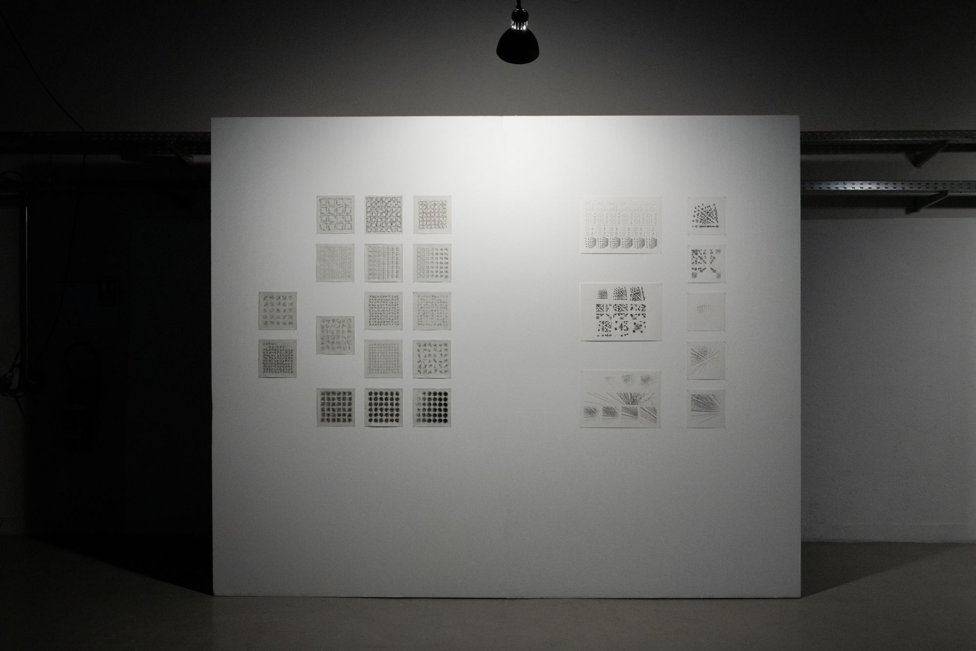 Dans une démarche proche du reverse engineering, des algorithmes reproduisant les formes de l'œuvre originale de Molnár sont écrit sous processing. S'ensuit une série de variations des propriétés graphiques de l'œuvre : superpositions de traits, points contenus dans une forme, distribution aléatoire des coordonnées ... Au fur et à mesure des itérations, les expérimentations glissent de l'image imprimé à un outil numérique de génération graphique incluant des propriétés absentes de l'œuvre de référence : interaction, déformation dans le temps, tridimension.