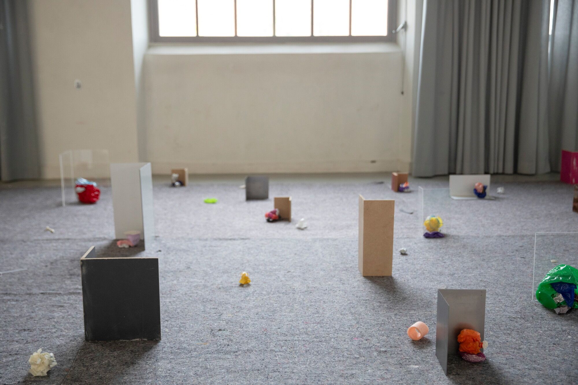 L’idée principale du projet sur le tapis est la composition : celle de chaque objet, celle des objets avec les coins, et celle qui unifie tout par le tapis et cet espace. Pour moi, ce sont des combinaisons de déchets, de restes.