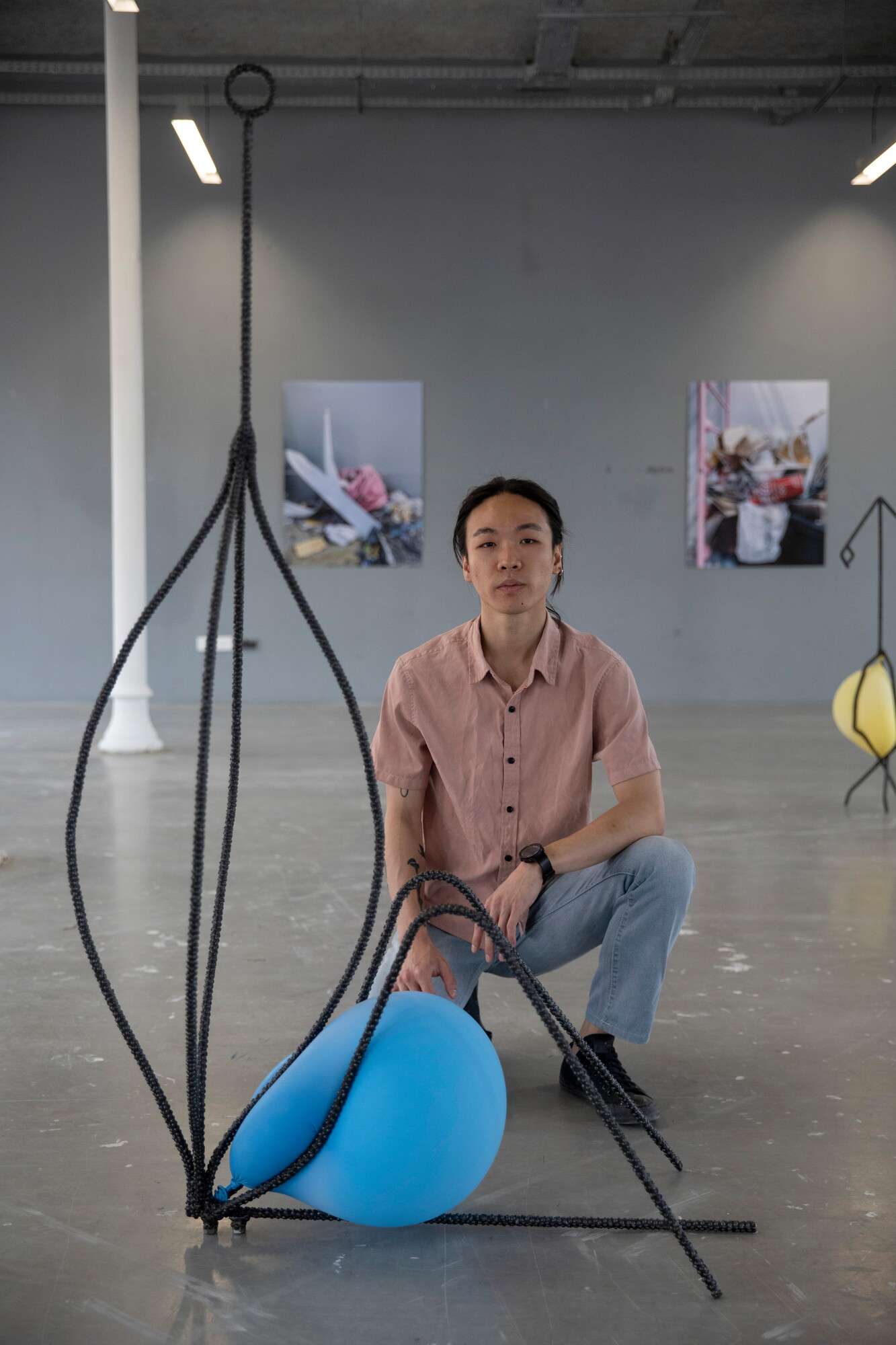 Les objets au mur sontfabriqués avec de la résine et la force du dégonflement du ballon. Ce sont lescouleurs mélangées et les formes qui ne sont pas possibles à contrôler, maisseulement à choisir.