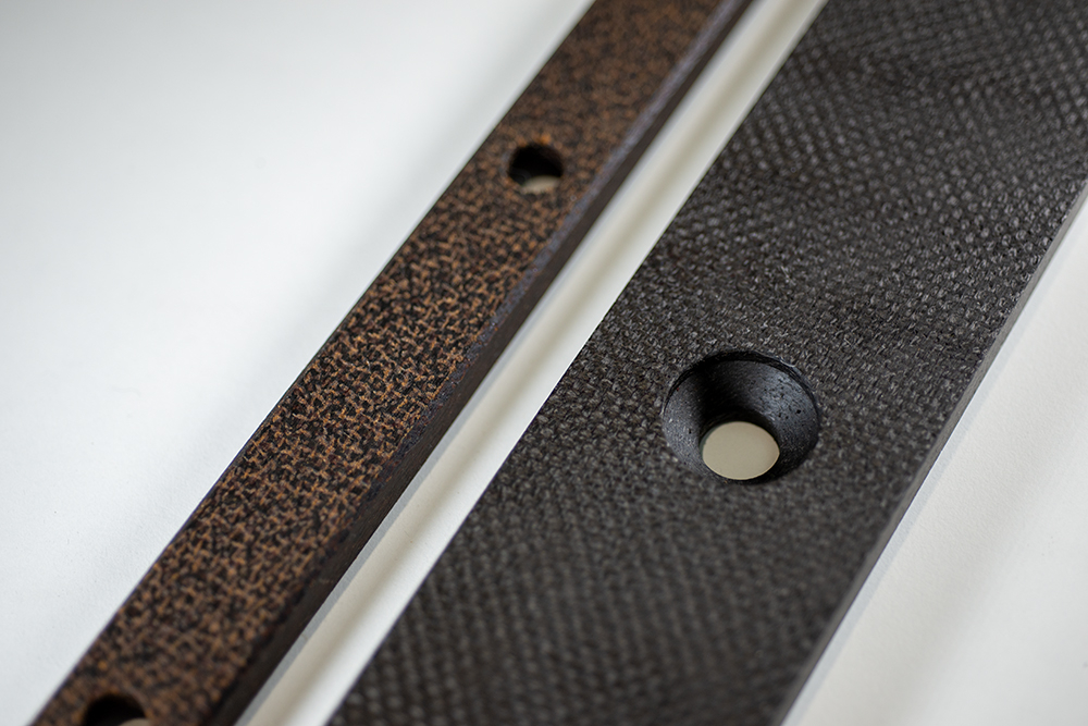 Seram is specialized in hot- and cold-cutting, engraving and laminating of different types of materials, such as textiles (including frayed textiles such as cotton, linen, lace, etc.), PU, wood, cork, mother-of-pearl, etc. The process enables us to- combine materials by polyurethane thermo-welding- engrave and cut with great detail- give a volume effect to a logo or motif by thermo-welding.