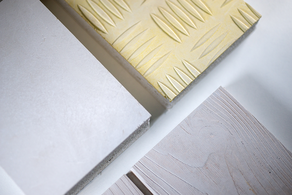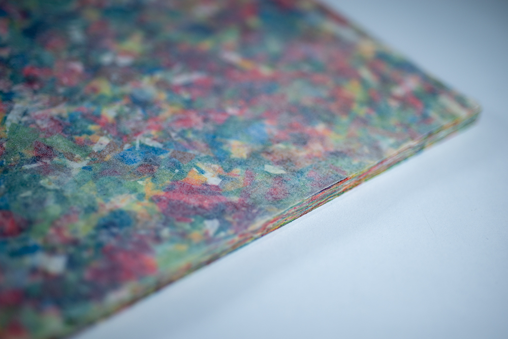 One of their flagship products is DROP® CAKE, a rigid panel made from 60% Drop® Paper waste and 40% polyethylene waste. Each sheet recycles around 270m2 of Drop® Paper. The sheets measure 1.25 x 2.40 m and are 10 mm thick. They are ideal for furniture, lighting fixtures, point-of-sale advertising, huts, etc.
